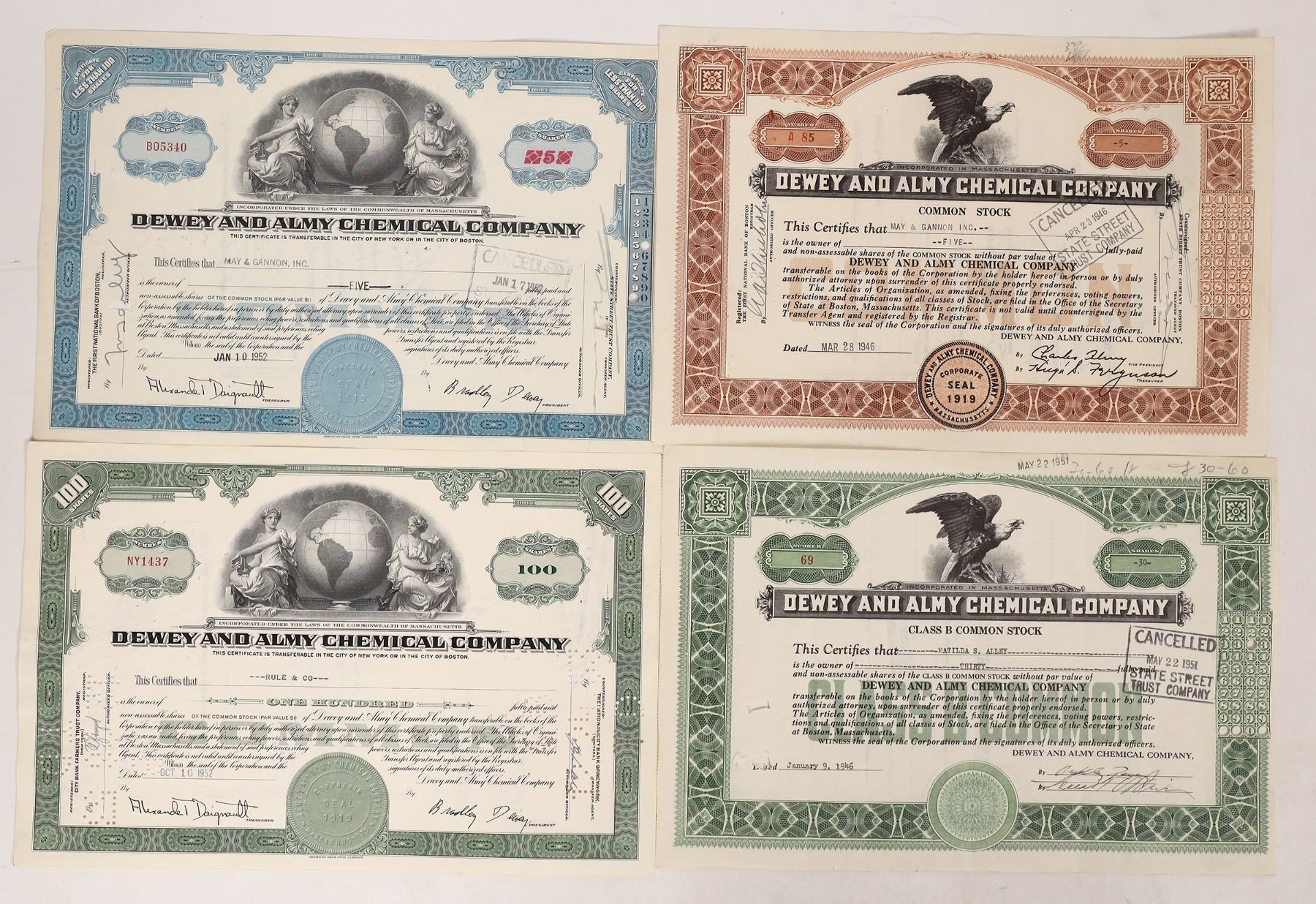 A set of four different Dewey and Almy Chemical Co. stock certificates, incorp. Mass., c1946-52. Please see photo(s) for more details.