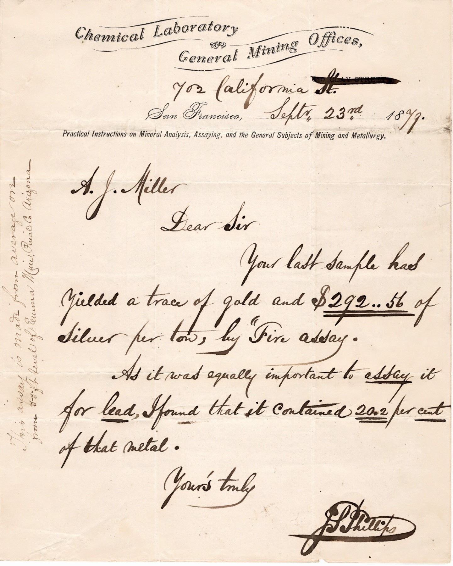 Chemical Laboratory & General Mining Offices Letter sheet - J. S. Phillips - Located at 702 California St. San Francisco. Earlier in 1873 Phillips had offices at 338 Montgomery St and at 423 Washington St. in San Francisco. See add below Salt Lakes City Directory 1873). This assay report is for the Emma Mine, Pinal County AZ. It is a four-page letter sheet for J. (Josiah) S. (Samuel) Phillips, Assayer, San Francisco, dated September 23rd, 1879. The letter and report refer to samples taken from the 55-foot level, which yielded $292 per ton of silver and 20.2% lead. Phillips was an important assayer and consulting mining engineer in the 1870s and 1880s. His breakout work was a book entitled, The Explorers, Miner's and Metallurgist's Companion, which he first published in 1872. At the time, this work was considered the most up to date, technical work on assaying. A second edition quickly followed in 1873 (682 pages). A full-page advertisement for a later edition of this book is part of this four-page letter sheet. Ephemera from Phillips is exceptionally rare, and this piece is an R8 and may be Unique. Very Fine. Size: 8 x 10 inches.
