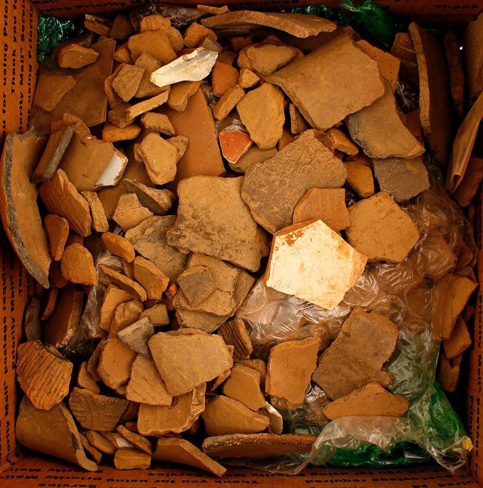 Large collection of clay pot shards collected by Roswell Georgia Native American researcher Mrs. Albert T Bradley Junior along the banks of the Chattahoochee River near Roswell, Georgia. This collection of hundreds of pot shards was collected in rural Georgia in the 1940s through the 1950s. They include a number of shards with widely differing patterns, from crosshatches, to circles, a variety of geometric patterns as well as circular patterns, indented patterns, and perhaps more rarely painted patterns. At least one shard shows a three-dimensional image of a pig. Some shards appear to protrude from the pot, indicating the possibility of a footed base. This is a fascinating study group. Probably all Cherokee. Mrs. Bradley collected only one full pot, also in this sale. Date: Location: Georgia HWAC # 50862
