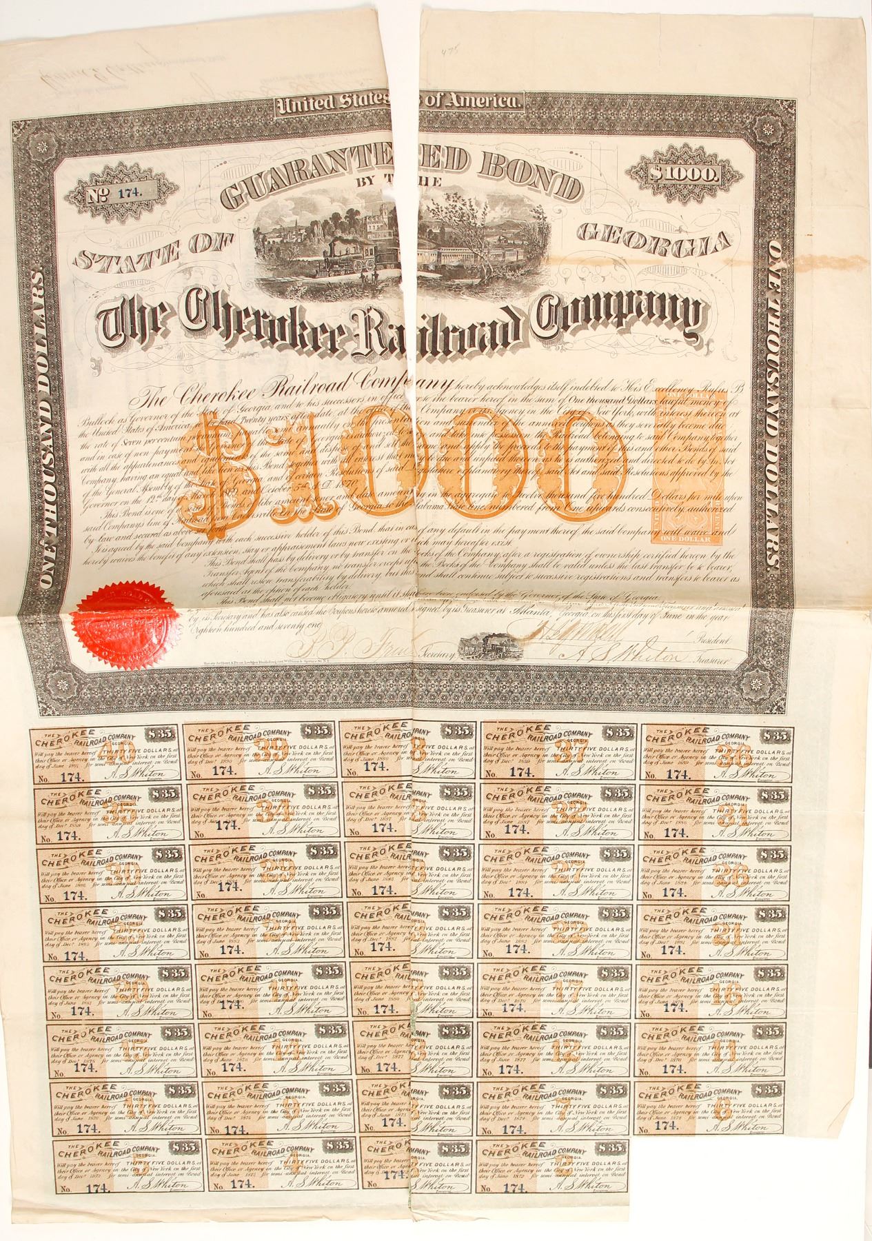 $1000 bond , strong vertical tear through top half. RN W2 at right. Castenholz p17. rare. Classic Georgia RR bond. State: City: Date: HWAC# 85770