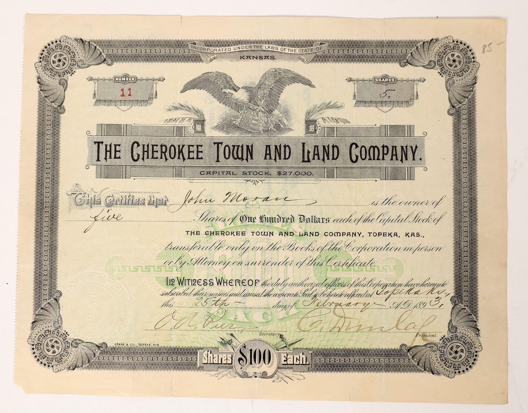 Cherokee Town and Land Company stock certificate issued to John Moran for five (5) shares at $100 per share. It's dated February 25, 1893 and signed by O.N Pierce secretary and C. Dunlap, president. Please see photos for more details. Kansas Topeka 1893