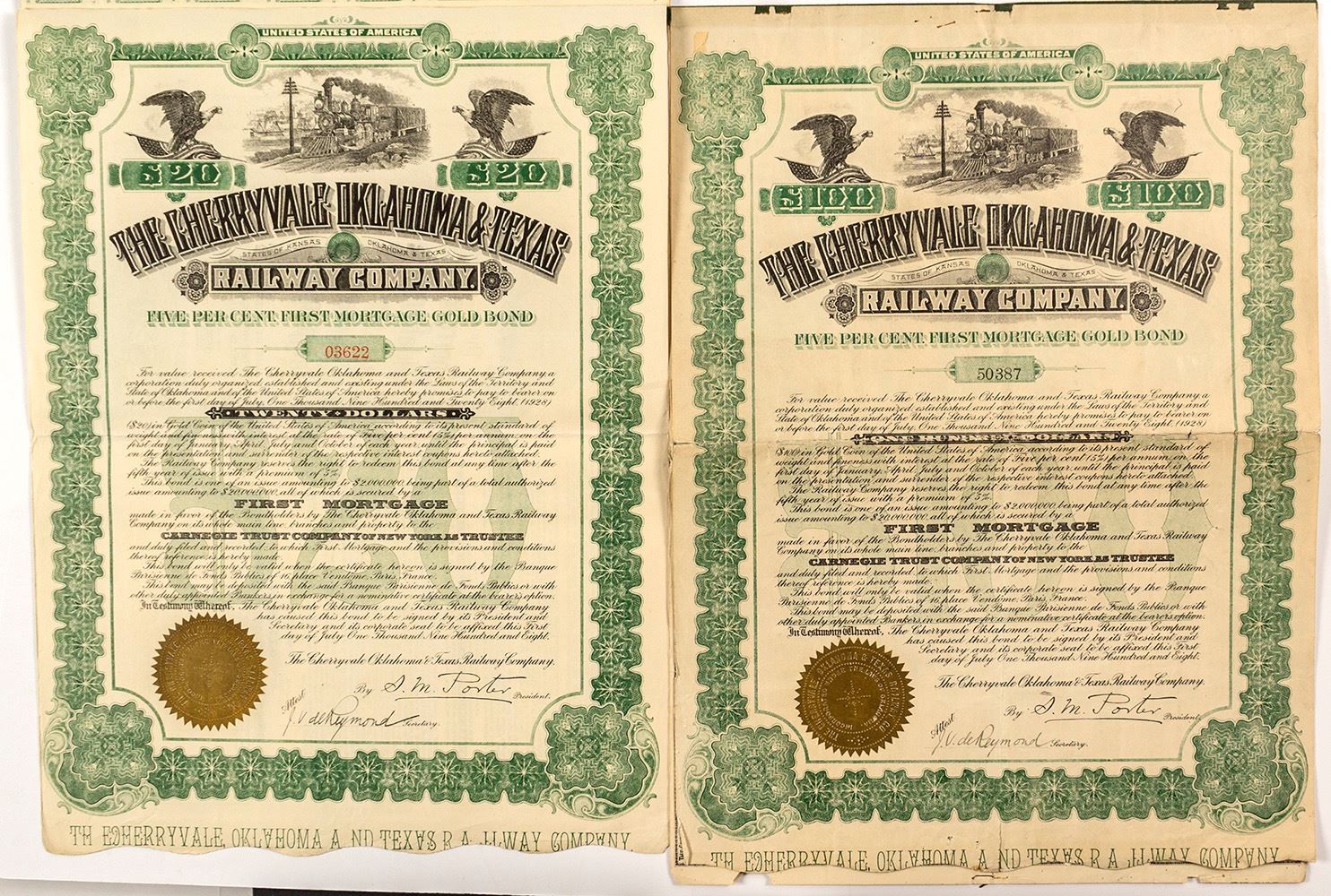 Green $20 5% gold bond #3622, green $100 5% gold bond #50387. Signed by president Porter. 11.25" x 15". HWAC# 52340 Date: Location: Oklahoma