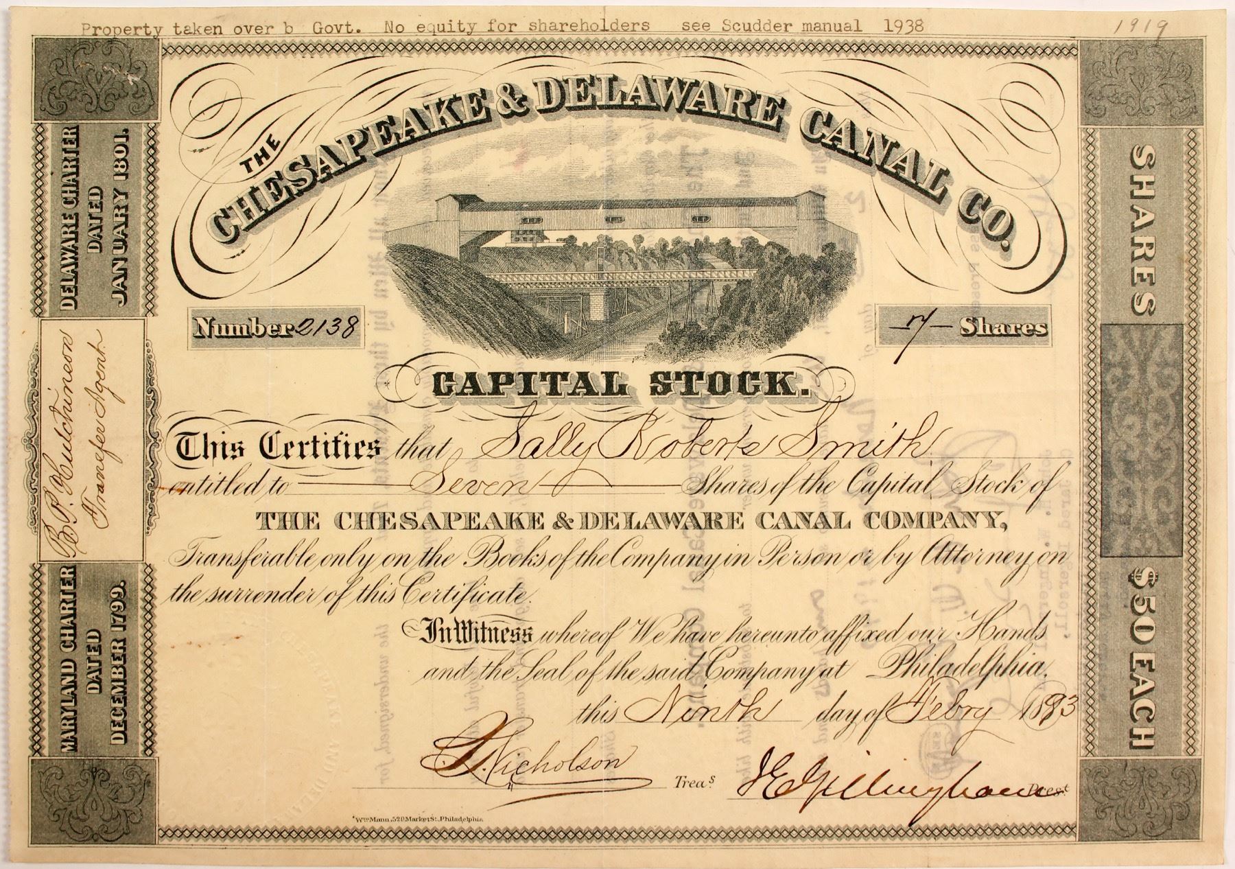 #2138 Sally Smith 7 shares 1893 signed by President illegible. The Chesapeake & Delaware Canal is a 14-mile (22.5 km)-long, 450-foot (137.2 m)-wide and 35-foot (10.7 m)-deep ship canal that connects the Delaware River with the Chesapeake Bay. 2 bridges over canal vignette. Prag Collection. State: City: Date: 1893 HWAC# 83378