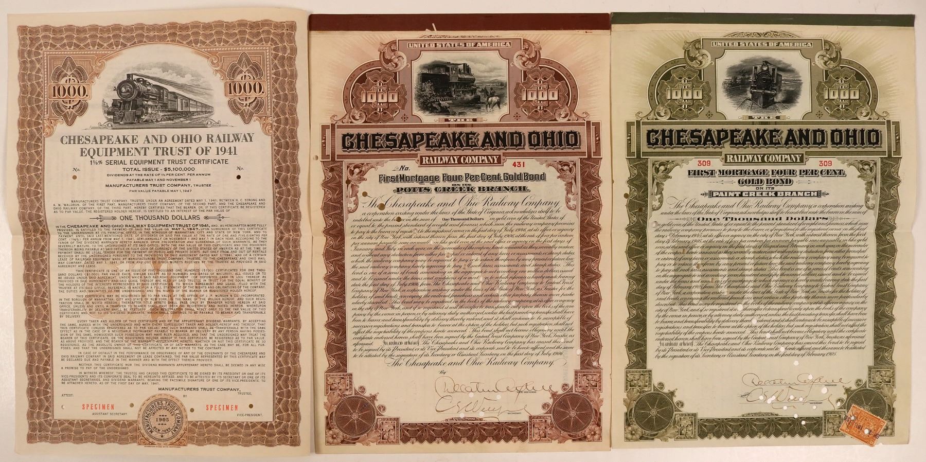 Three certificates in this lot. Cert. #431, Brown, $1,000, 1st Mortgage, 4% gold bond on it's Potts Creek Branch. Nice vignette of a train with one car passing a man on horseback in the creek. Hole cxls. International Bank Note. 2) Cert. #309, olive, 1st Mortgage, 4%, $1,000 gold bond on its Paint Creek Branch. Oncoming train vignette. Same printer. Hole cxls. 3) Chesapeake & Ohio Railway Equipment Trust of 1941, 1 5/8%, Serial Equipment Trust Certificate due 1947. Marked, "SPECIMEN" in red. Coupons at the right. Small hole punches thru certificate. Hamilton Bank Note, Litho.