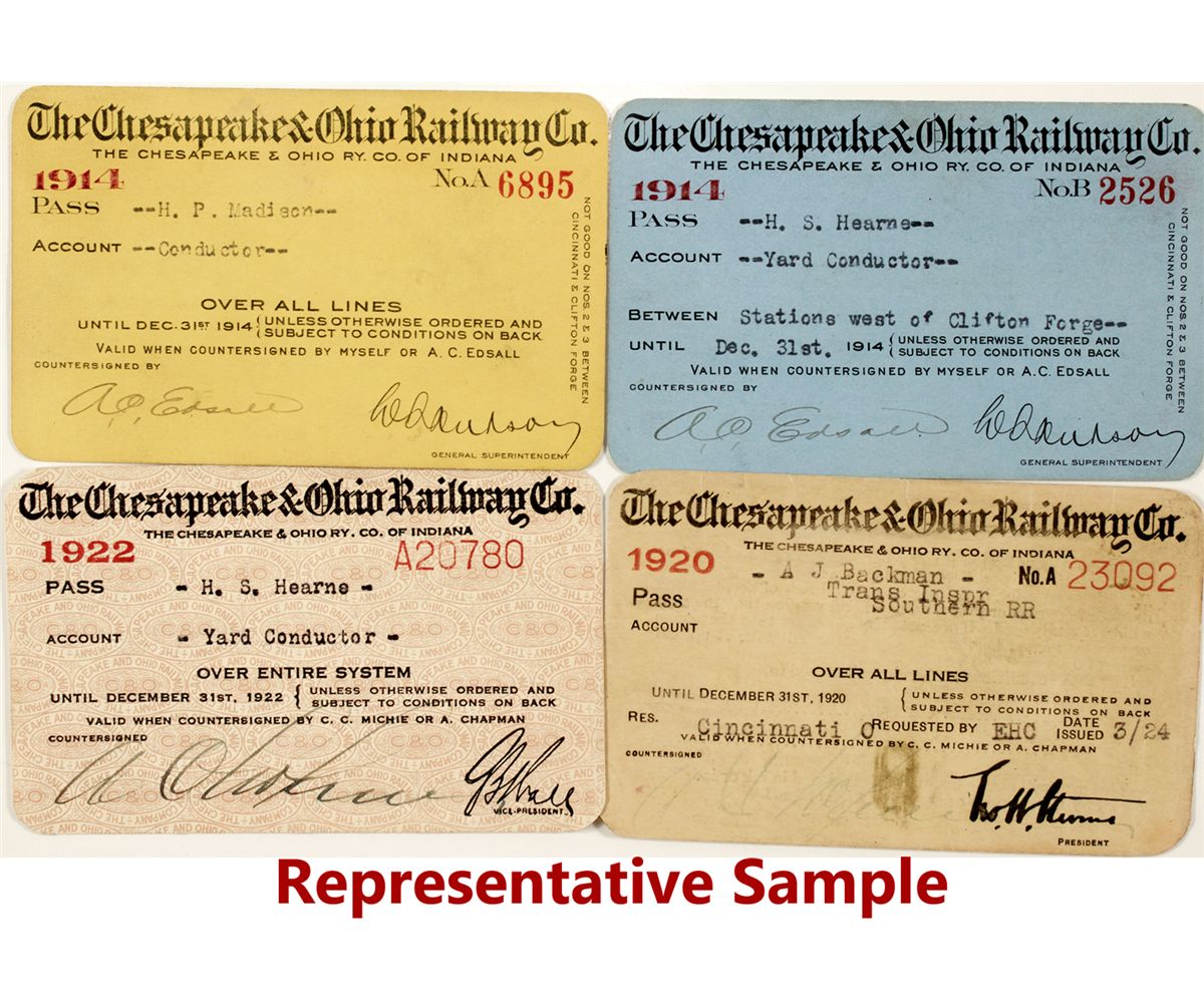 Eighteen passes including duplicates: 1914 (5 w/ 3 diff. colors), 1916 (2), 1918 (3), 1920, 1922 (2), 1923, 1924 (2), 1928, and 1929. Prag Collection