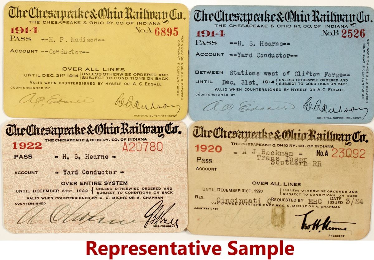 Eighteen passes including duplicates: 1914 (5 w/ 3 diff. colors), 1916 (2), 1918 (3), 1920, 1922 (2), 1923, 1924 (2), 1928, and 1929. Prag Collection City: State: Ohio Date: hwac# 23254