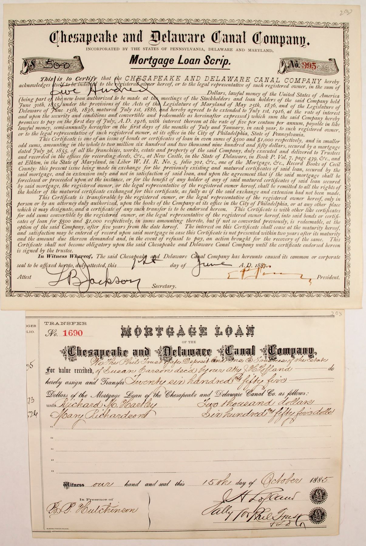 1885 mortgage loan #1690 $2650. Scrip #395 $500 1887 signed by President illegible. Prag Collection. State: City: Date: 1885-1887 HWAC# 83377
