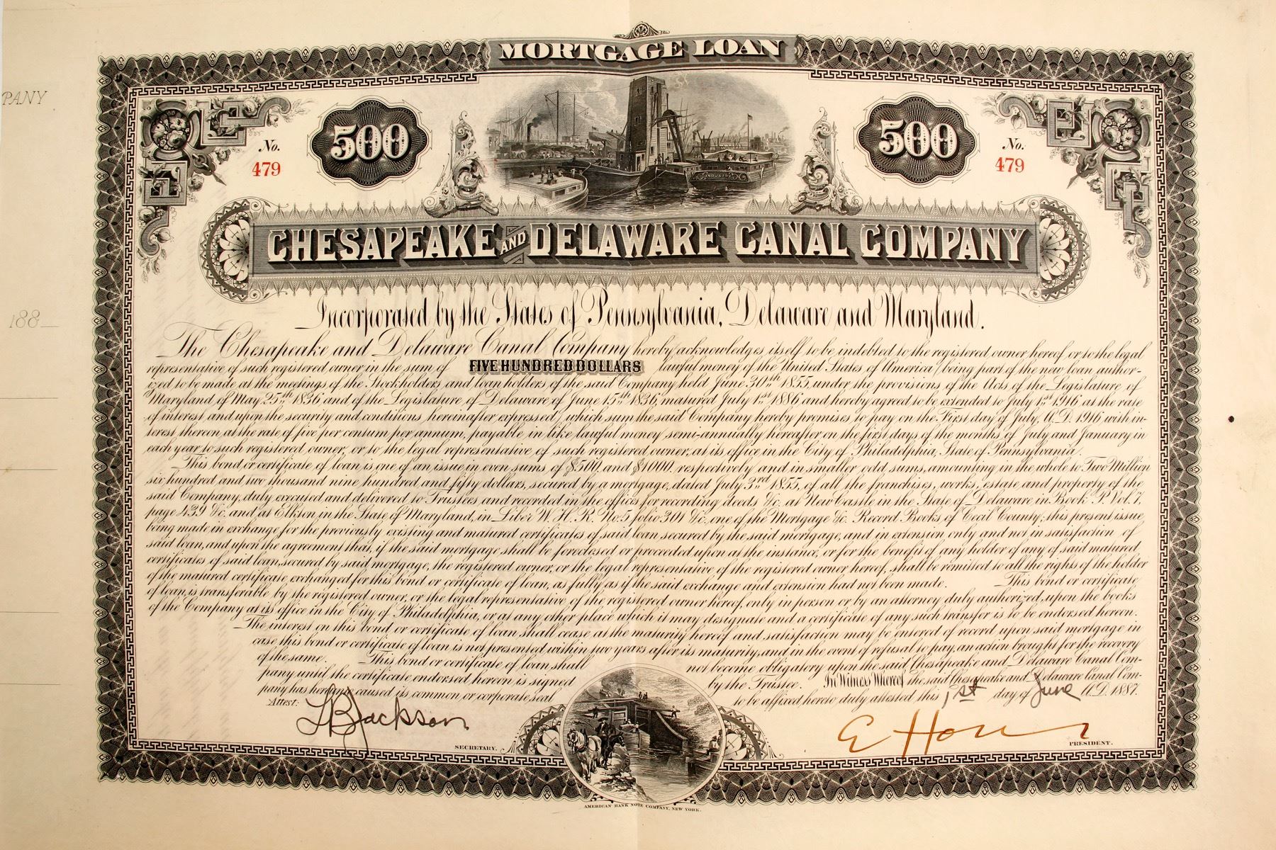 #479 $500 5% mortgage loan. Inc in PA, DE and MD. Signed by President Horner. Small ink stain, dogear."The Chesapeake & Delaware Canal (C&D Canal) is a 14-mile (22.5 km)-long, 450-foot (137.2 m)-wide and 35-foot (10.7 m)-deep ship canal that connects the Delaware River with the Chesapeake Bay in the states of Delaware and Maryland in the United States." from wikipedia. Prag Collection. State: City: Date: 1887 HWAC# 83379