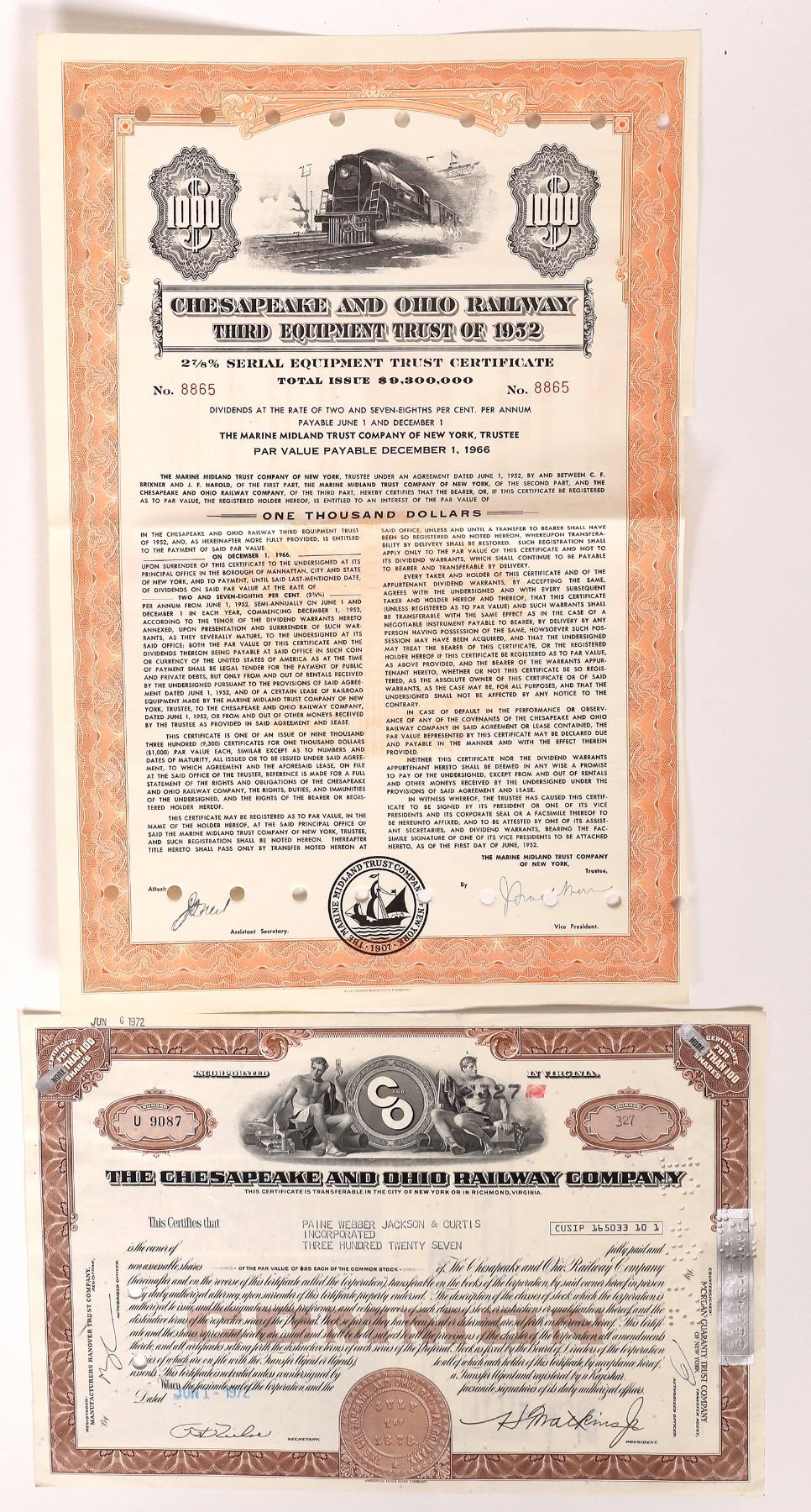 1952 orange I/C $1000 2.5% serial equipment trust bond. I/C 1972 brown stock.