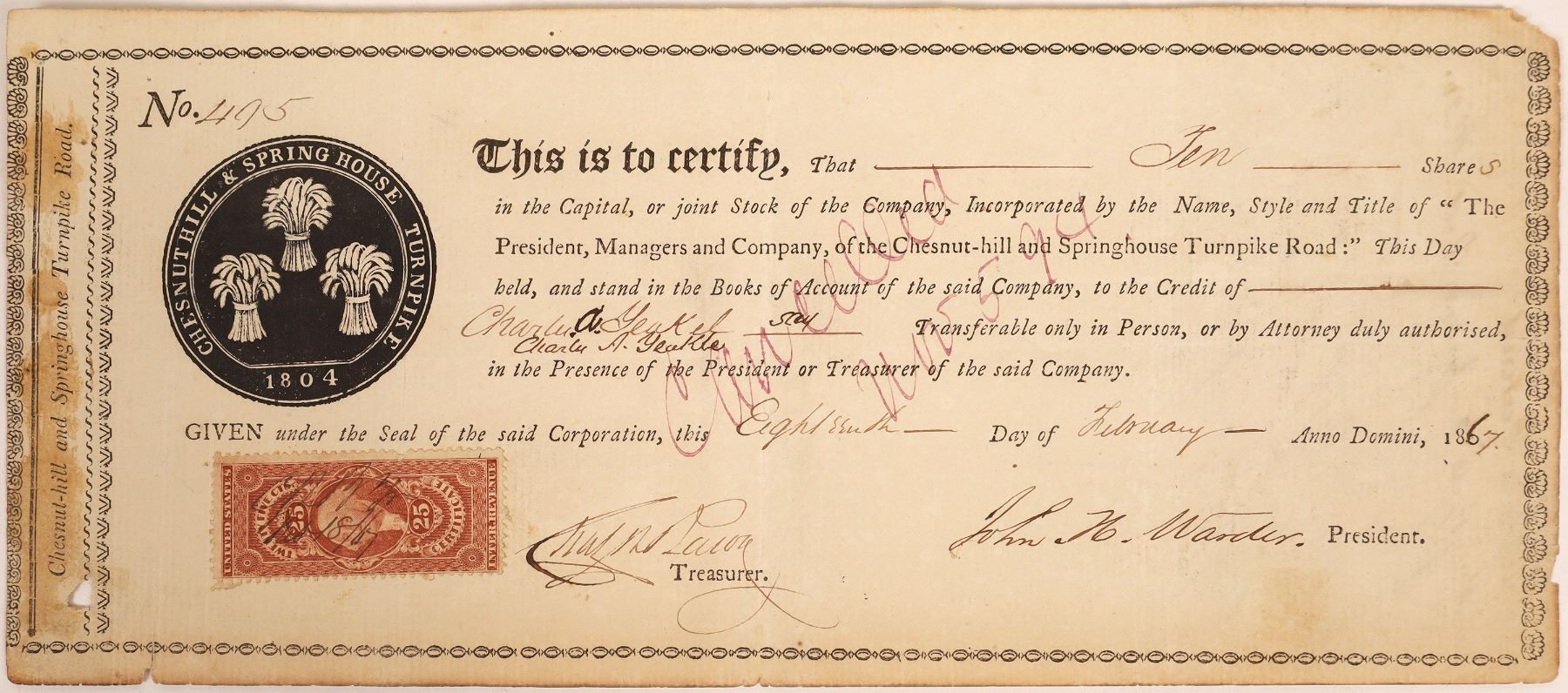 No. 495, issued for 10 shares to Charles Yeakle in 1867. Signed by president John Warder and the treasurer (illegible). Pen cancelled. Black border and print with illustrated company logo. 25 cent adhesive revenue stamp. Stains, hole on left border. 4.5 x 10.25" Chestnut Hill (note correct spelling) is located near Philadelphia. Spring House is in Montgomery County, PA.