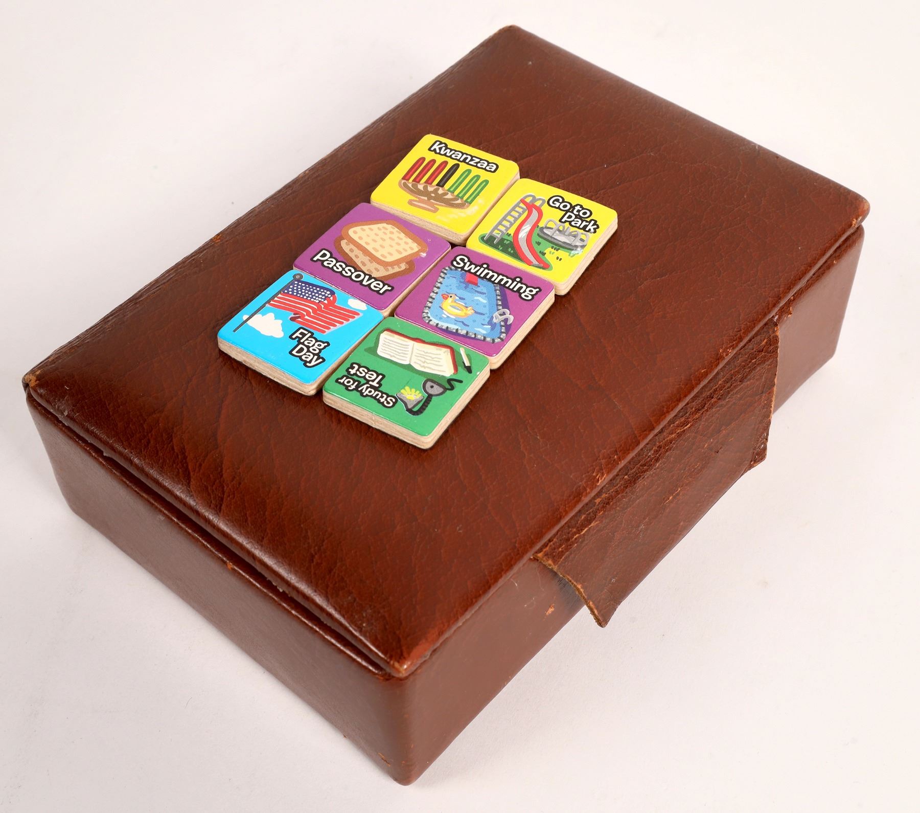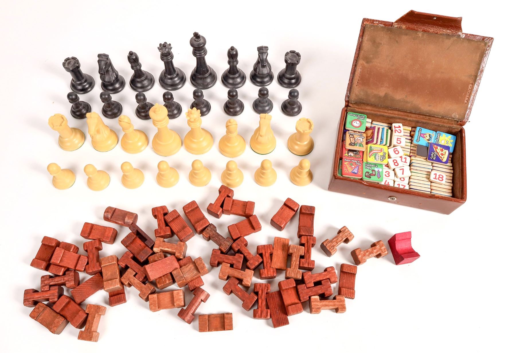 Set of 32 plastic chessmen by Drueke, 1.5-3.5" with weighted bases. Leather case with unknown game pieces, 1.75x6x4.25". Bag of wood game parts.