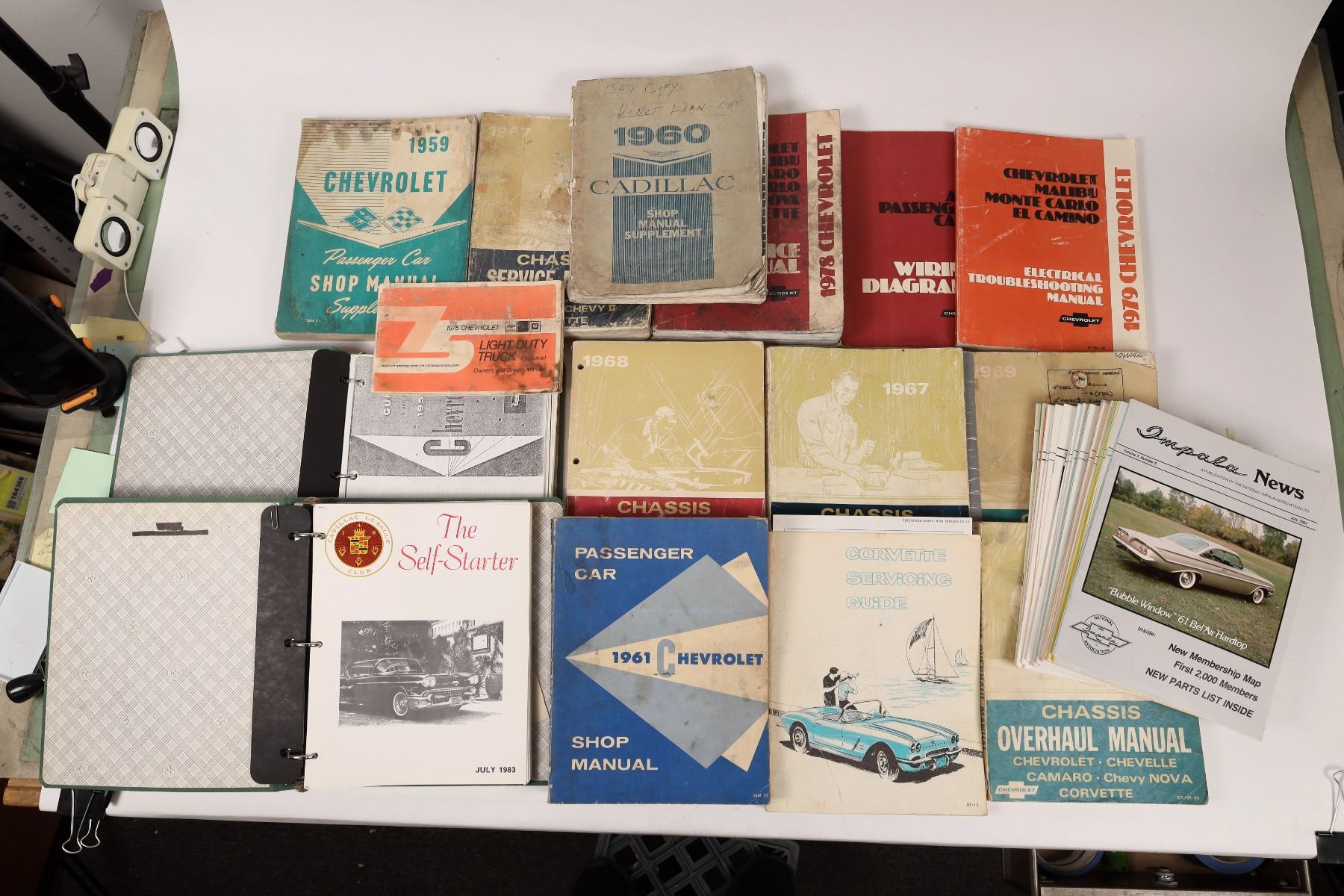 There are two shop manuals for the Cadillac 1958, 1960. The '58 is for the 62 series coupe in a three ring binder. A 1960 Cadillac Shop Manual Supplement, foxed corners heavily used. A Chevrolet Shop Manual for 1953-1958 in a three ring binder, very good condition. A Chevrolet passenger car shop manual supplement for 1959; Passenger car shop manual 1961 Chevrolet very good condition. Corvette Service Guide 1962 torn cover otherwise very good condition. A 1968 Chassis Service Manual for Chevrolet in very good condition. A 1967 Chassis Service Manual in fair condition. The 1967 Chassis Overhaul Manual heavily notated fair to good condition. A 1969 Chassis Service Manual heavily notated fair condition. 1969 Chassis Overhaul Manual some foxing very good condition. Two 1978 Chevrolet Service Manuals; service and electrical. 1979 Chevrolet Electrical Troubleshooting Manual well illustrated in very good condition. Plus over twenty issues of NIA the National Impala Association from 1981 to 1983.