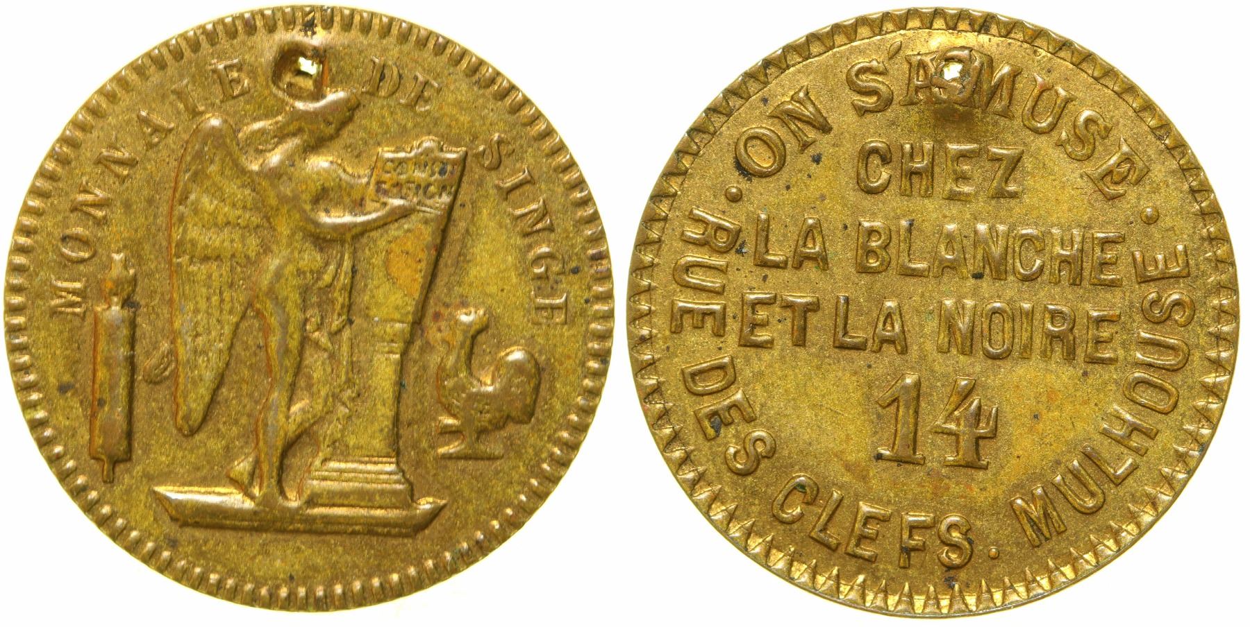 Obv.: On Samuse / Chez/ La Blanche / Et La Noire / 14 / Rue Des Clefs. Mulhouse; Rev.: Monnaie De Singe. Br. rd., 21 mm.