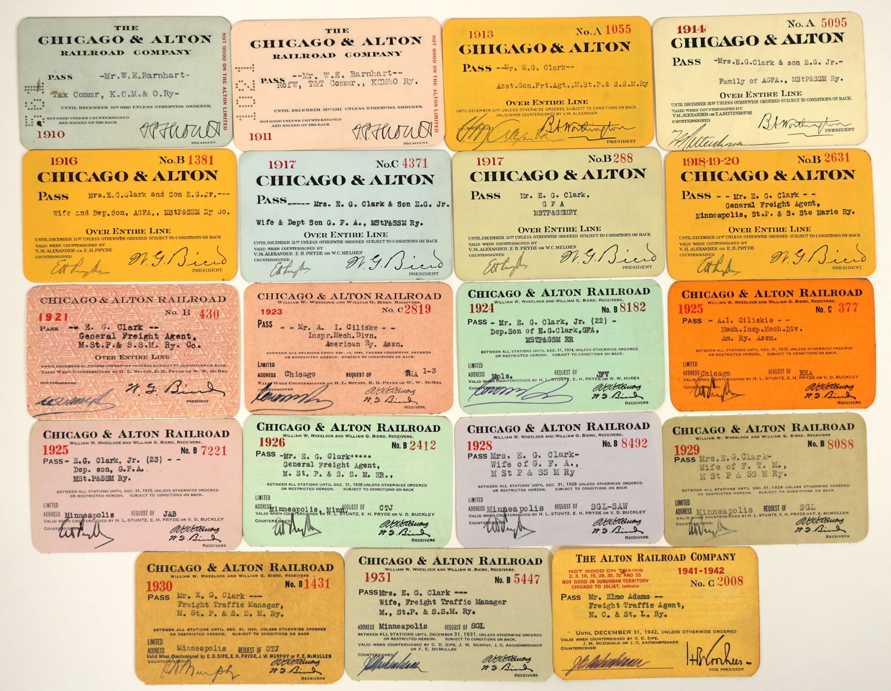 Group of 19 railroad passes from the Chicago & Alton Railroad Company. Passes date from the early 1900s; see photos for specific years and additional detail.