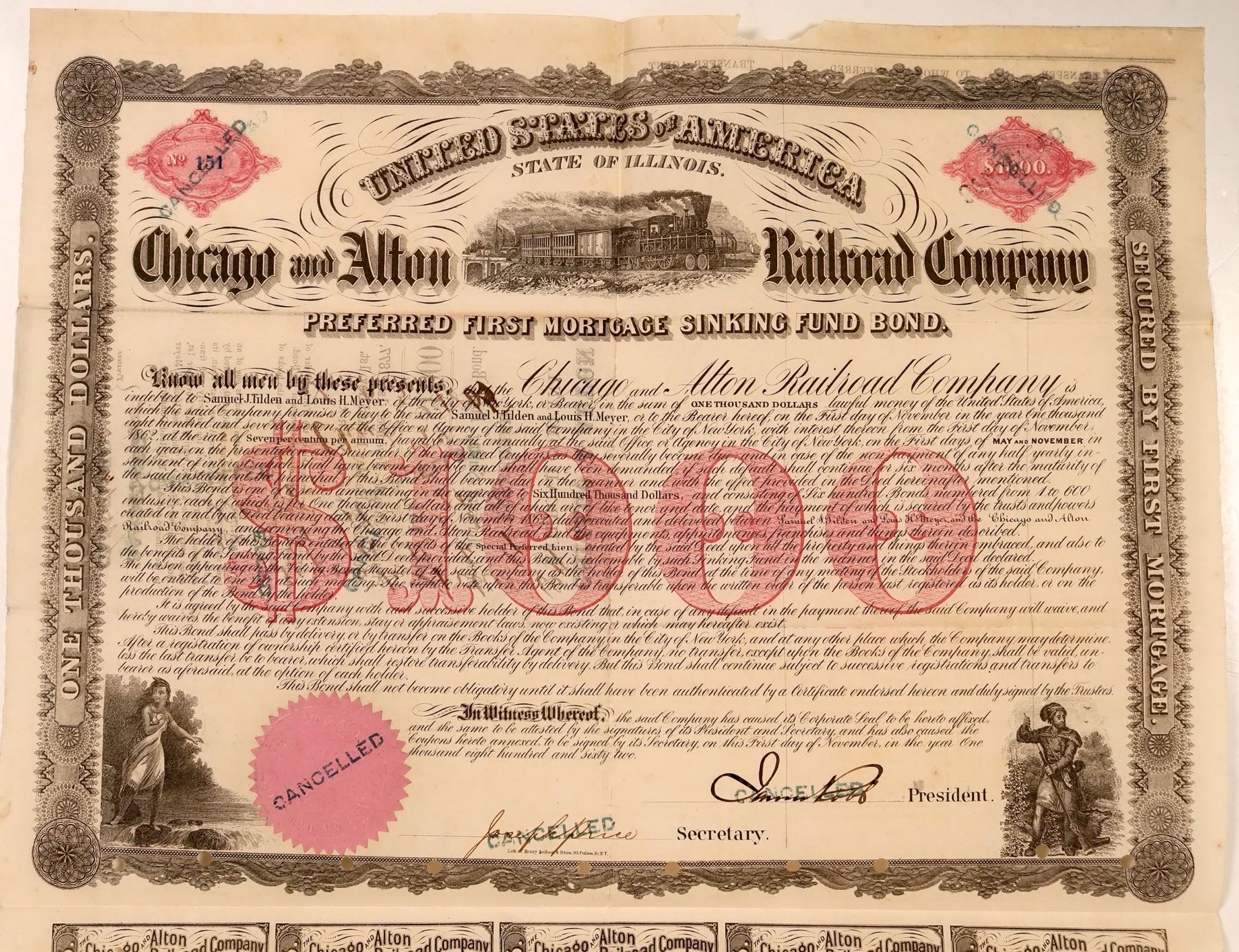 Cert. #151, issued in 1862. Train runs left to right. Black and pink. $1,000 Pfd. 1st Mtg. Sinking Fund bond. 15 year, 7%. Lady Indian lower left and frontiersman at lower right. Stamp cxls. and hole punches at bottom of body and through coupons. Piece missing from top border. Please inspect lot.