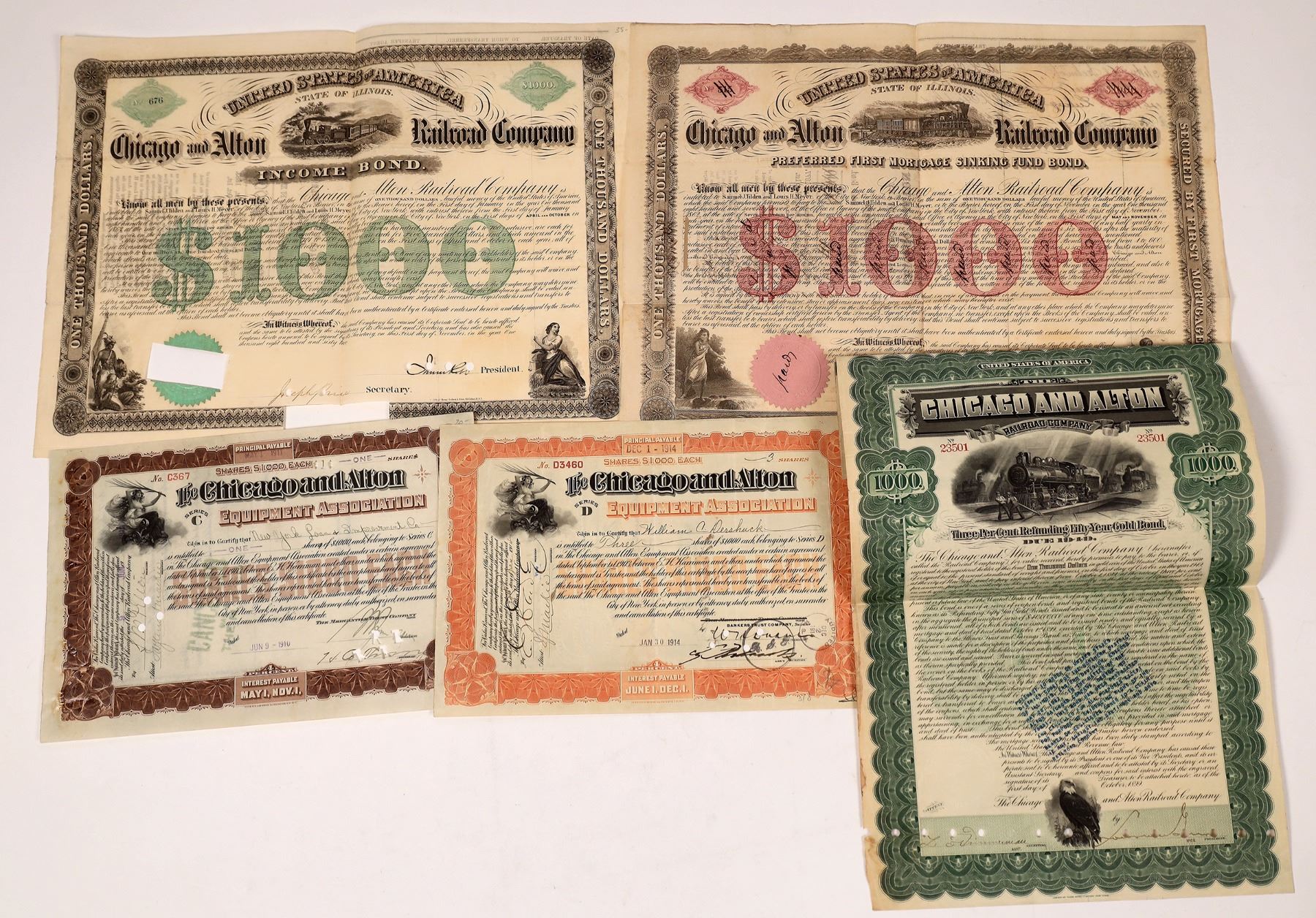 Lot of 5 different. Includes: two different $1,000 bonds issued in 1862 (one pen cancelled, one punch cancelled), both with locomotive vignette; $1,000 bond issued in 1899 (punch cancelled), locomotive vignette; and two different stocks for the Chicago & Alton Equipment Association, 1910 and 1914, both punch cancelled.