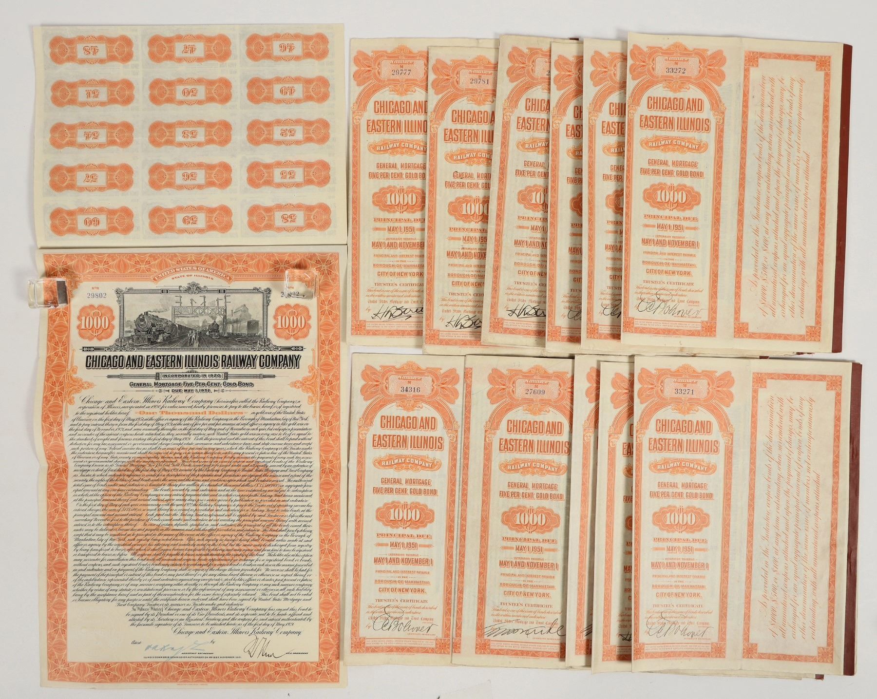Lot of 13. I/U/ Issued 1921. EF cond. Chicago And Eastern Illinois Railway Co, $1000, 5%, gold bearer bonds, coupons attached. American BNC printer.