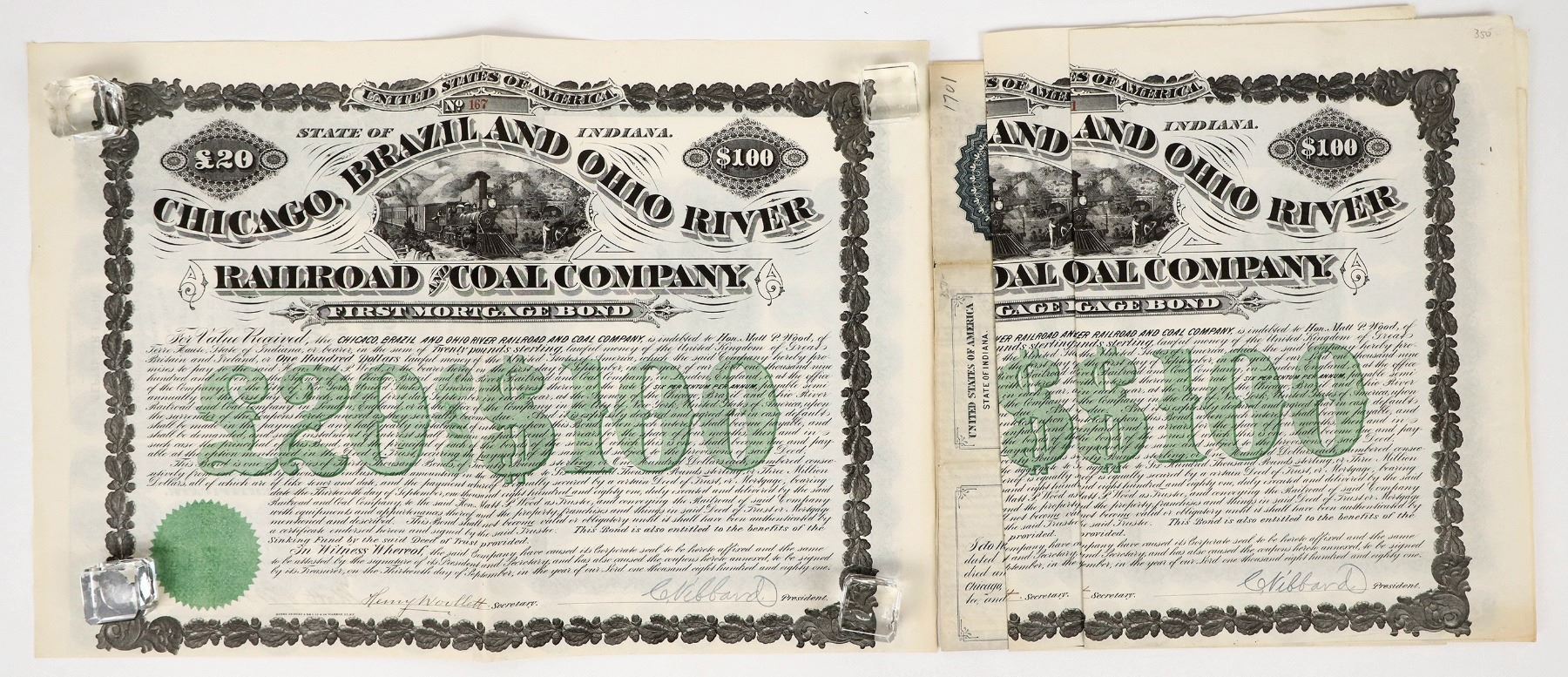There are four bonds in this lot for the Chicago, Brazil and Ohio River Railroad and Coal Company issued in 1881. Coupons are attached. Please see photo for details.