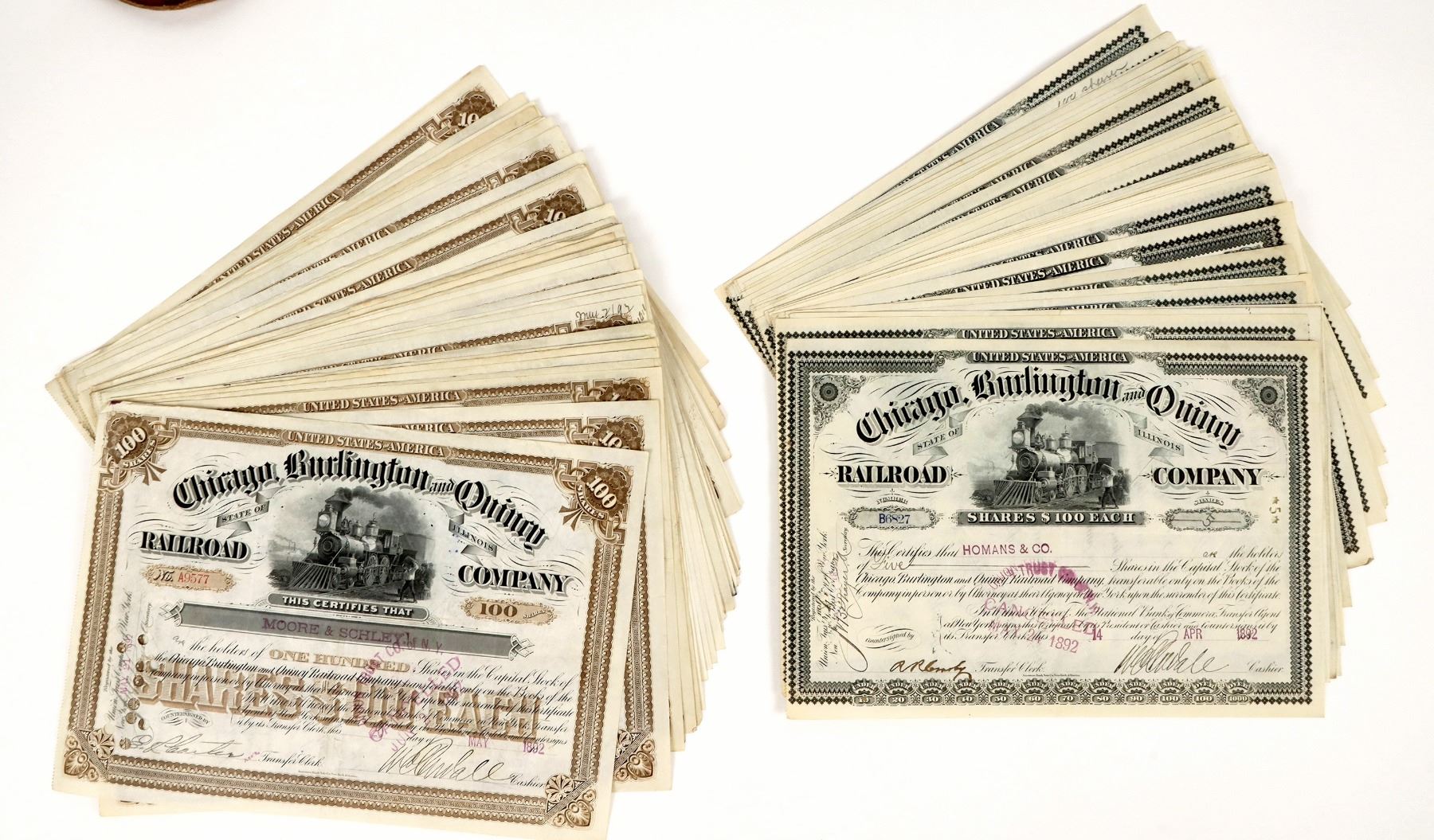 Group of approx. 90 stock certificates from the Chicago, Burlington and Quincy Railroad Company, issued 1885 through 1892. Lot includes brown and black varieties of the design. All issued and cancelled with ink stamp cancellations. Nice vignette of locomotive. 11"x7.75" certs, some light toning; see photos.