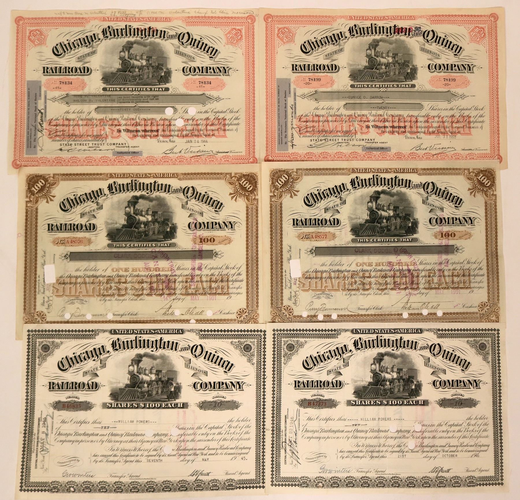 6 certificates. Incorp. All I/C, vignette 4-4-0, SHARES $100 EACH in underprint. signed by president. issued 1901-46. One has revenue stamp. American Bank Note Co. printer. VF-EF. Two orange, two brown (100 shares) and two black (under 20 shares).
