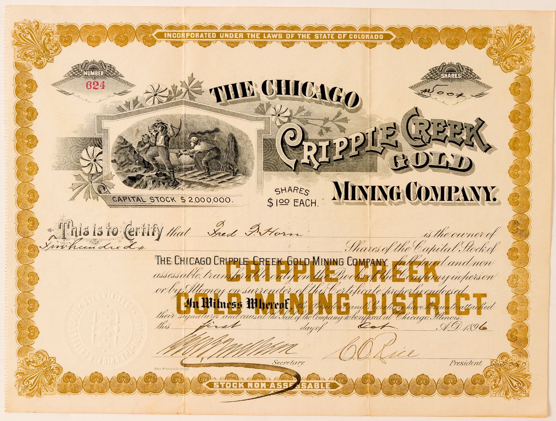 Choice! Inc. in Colorado. No. 624, issued for 500 shares to Fred Horn on Oct. 1st, 1896. Signed by president CC Rice and the secretary (illegible). Not cancelled. Gilt border. "Cripple Creek Gold Mining District" printed in gold in the background. Ornate logo with flowers and a mining vignette. Printed by Rand McNally & Co., Chicago. 8.25 x 11" Deep folds, otherwise very nice condition. Not listed in Hills. The company was involved in an 1899 lawsuit where the Matoa Gold Mining Co. alleged the Chicago-Cripple Creek had been entering their mine and taking ore. It seems to revolve around use of a tunnel built by the company that went through Gold Pass No. 1. [See: Mining & Sci. Press, April 8, 1899] () Ken Prag Collection