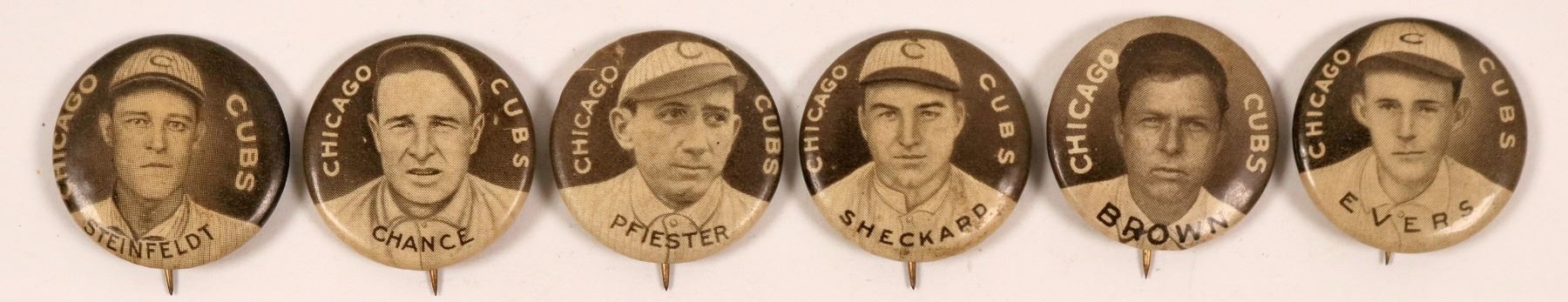 Lot of six Sweet Caporal cigarette photo pins (22 mm): Evers, Brown, Chance, Sheckhard, Pfiester, Steinfeldt. Steinfeldt was the starting third baseman for the Cubs in the final game of the 1908 World Series. He was the fourth infielder on a team that gained fame for a double-play combination of "Tinker to Evers to Chance."
