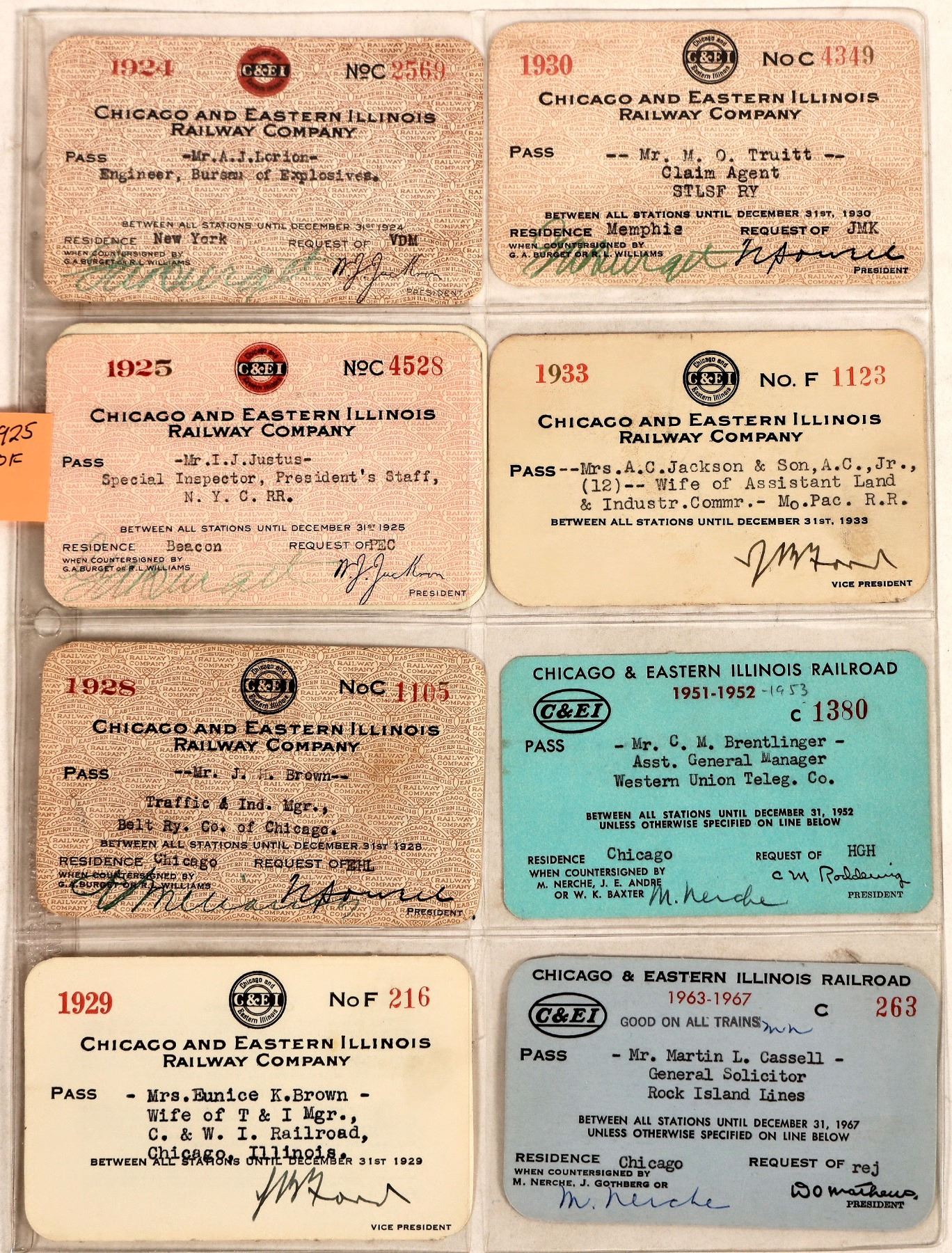 Lot of 8. In protective plastic sleeve and excellent cond. Founded in 1877 as a consolidation of three RR's and operated until 1976. RR passes : 1924,'25 (two), '28,'29,'30,'33,'51-52 and '63-67. All passes have the company logo imprinted on the face, representing three different styles.