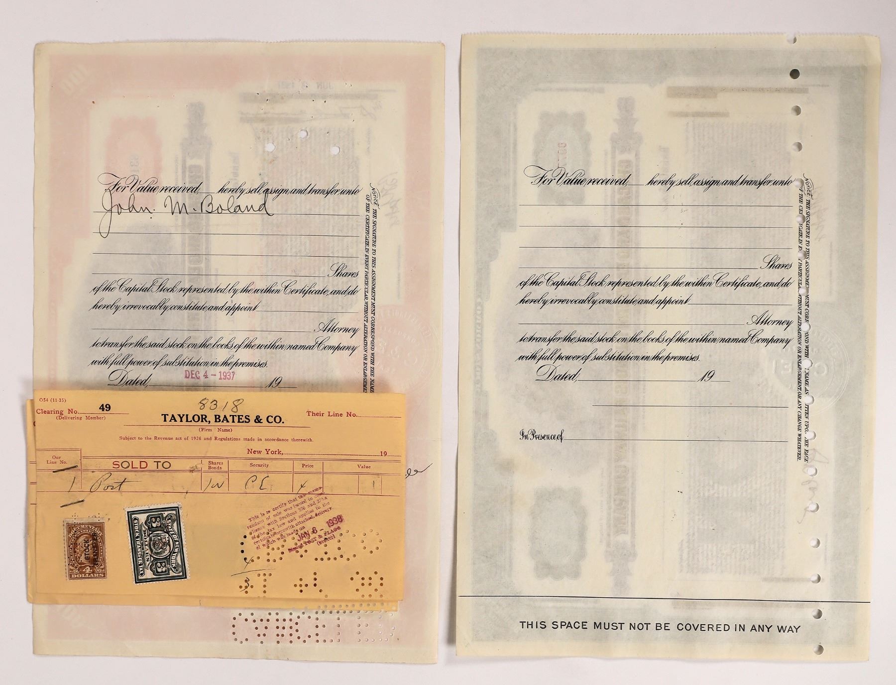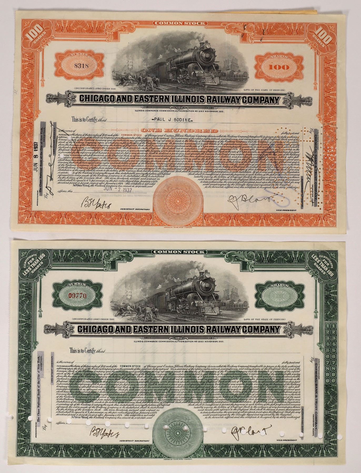 Chicago and Eastern Illinois Railway Co, Stocks, Incorp Illinois: 1. No. 09770, u/i but canceled, signed by vice president and asst secretary (illegible), 1924, 11.5x8"; 2. No. 8318, 100 shares, issued to Paul J. Bodine, signed by vice president and asst secretary (illegible), 1937, 11.5x8", i/c, two receipts and three revenue stamps attached. 2 certs