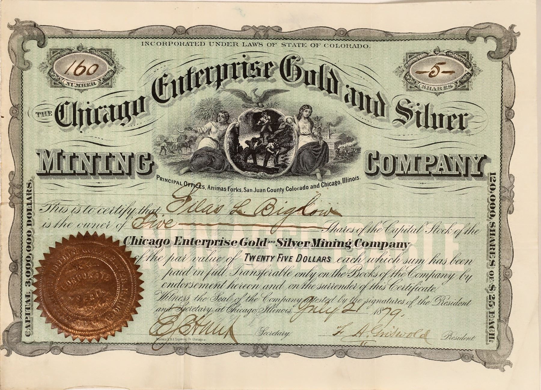 Principal Offices at Animas Forks and Chicago. No. 160, issued for 5 shares to Silas Biglow in 1879. Signed by president Griswold and secretary Hunt. Not cancelled. Black print, gold seal, green background, and allegorical and mining vignettes. Deep folds and creases, pinholes. 7.5 x 10.25" Owned 4 claims: White, Emma N. and Little Bessie in the Horseshoe Basin and on the NW slope of Wood Mountain, 1.25 miles NE of Animas Forks, Eureka District; and Path-finder on the NW slope of Cinnamon Mountain. [C&L, 1883, pg. 623]
