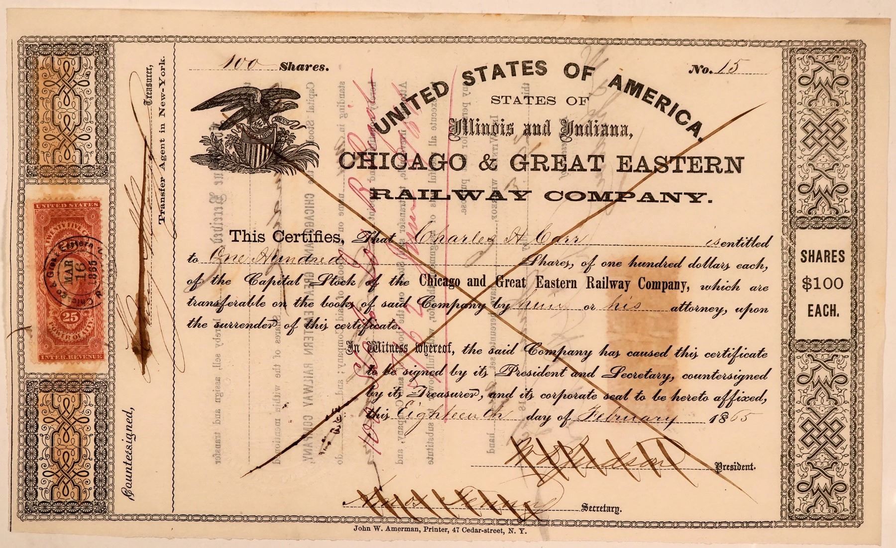 Cert. #15, issued for 100 shares to Charles H. Carr and signed by W.D. Judson as president. Eagle on shield with outstretched wings at top left. 25 cent revenue stamp at left stamped with the railroad's seal in 1865. A large X to cancel and pen cancels thru signatures. John W. Amerman, N.Y. printer. Black on creme. Odd shares.