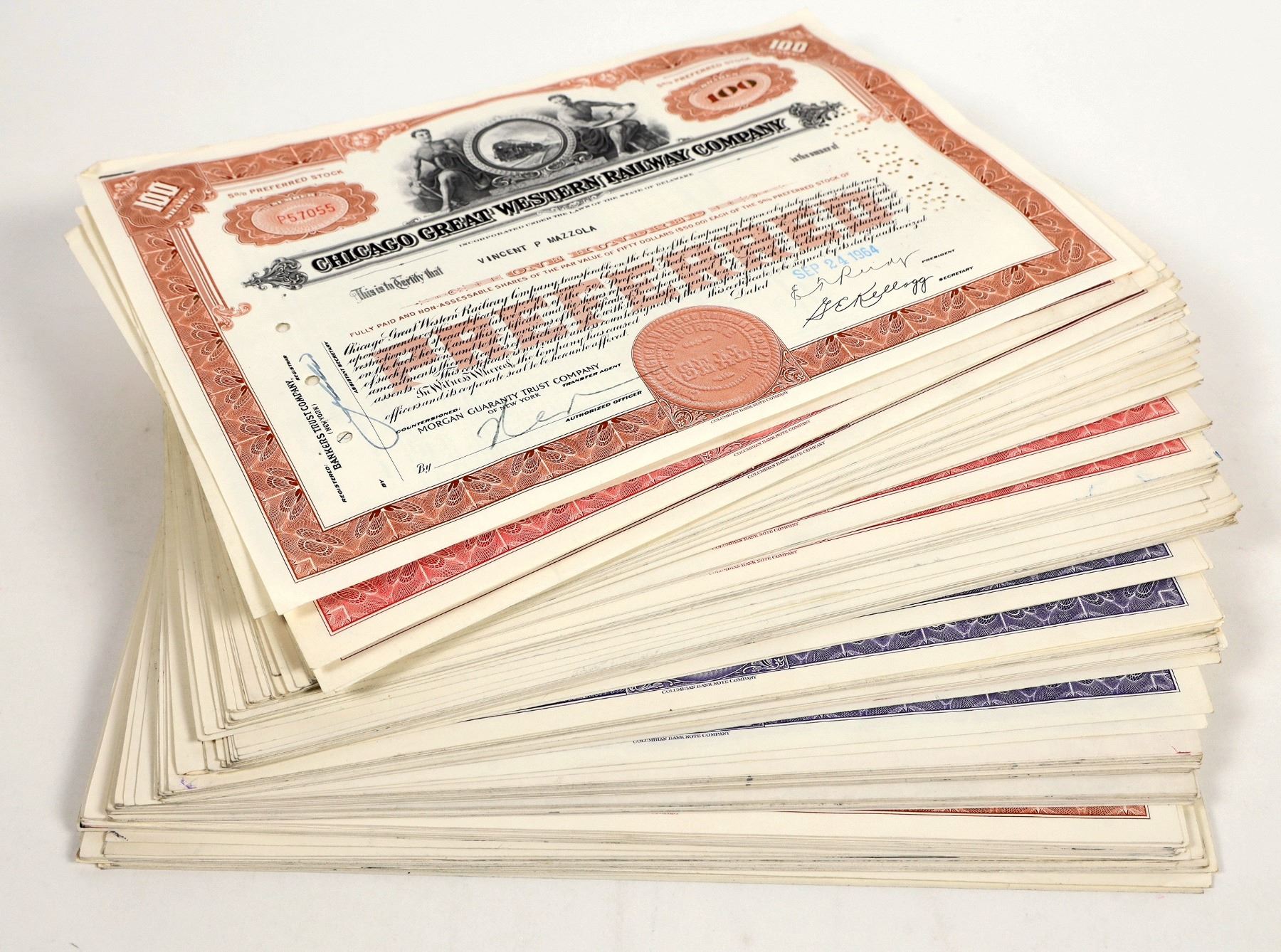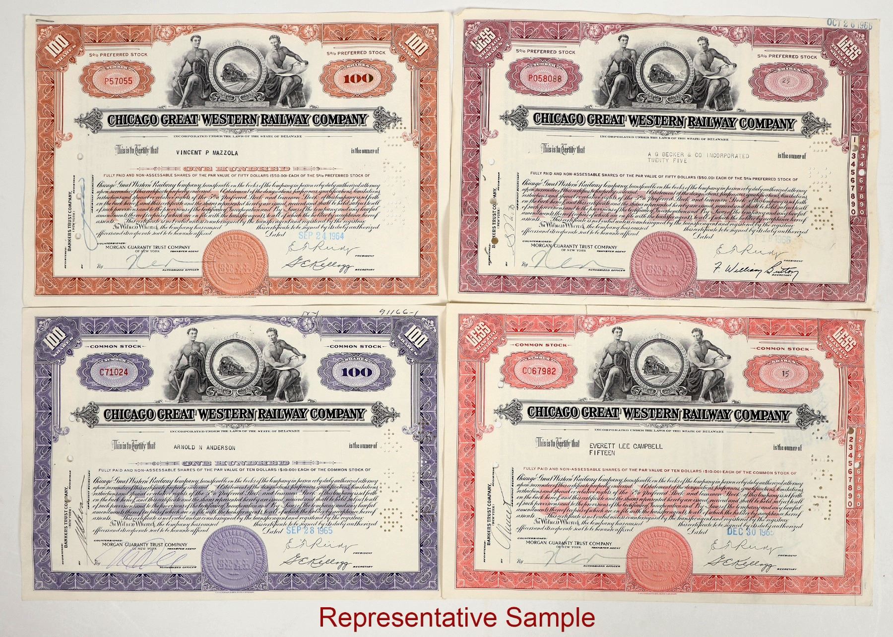 Over 200. I/C. Issued 1956-67. Chicago Great Western Railway Co. stocks. VG or better Columbian BNC printer.