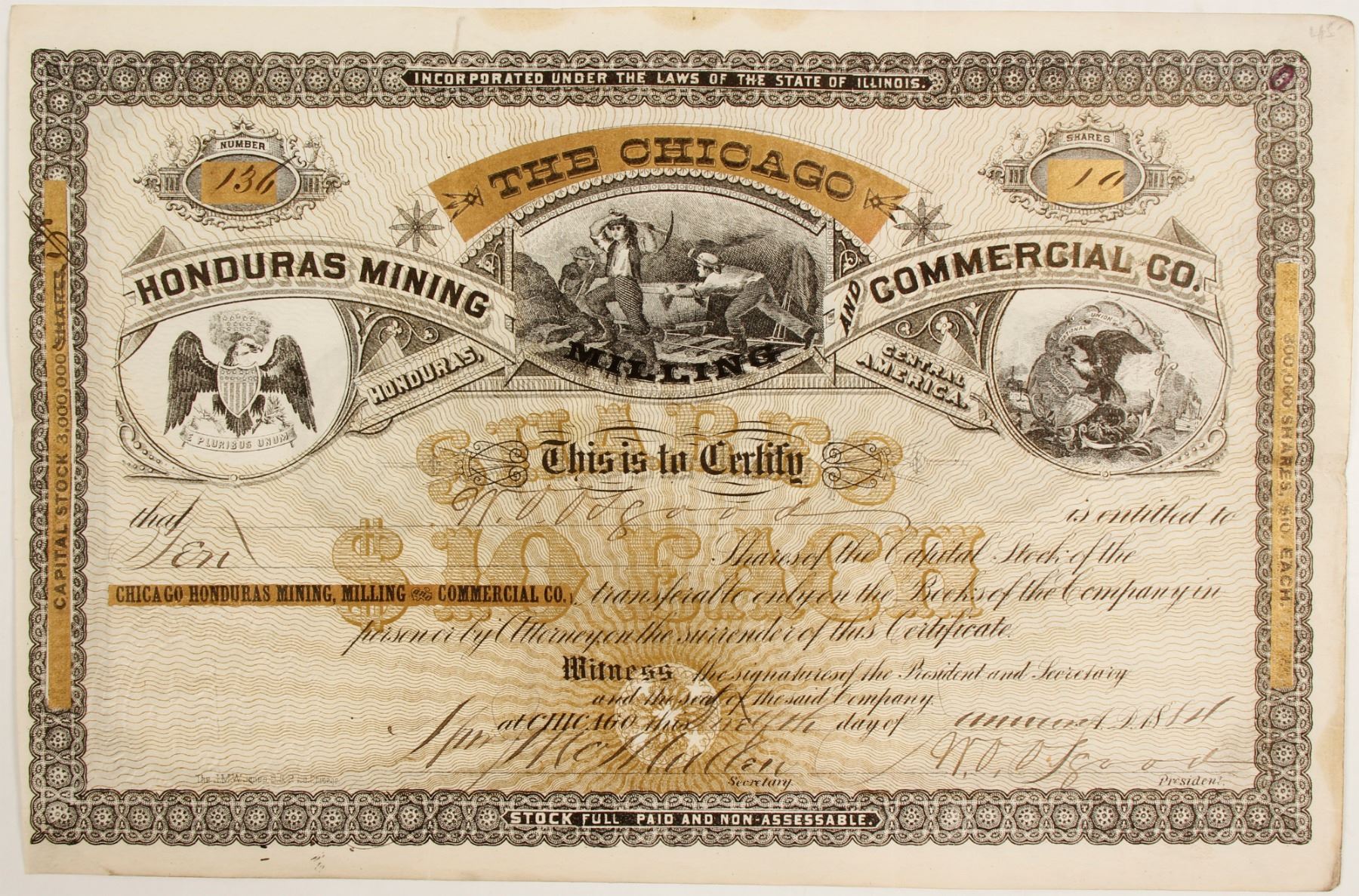 # 136 for 10 shares to WO Osgood. signed by William McMullen and president WO Osgood. Dateline Chicago 1884. Spectacular looking stock with a few miner edge issues. Brown wavy background, brown fancy underprint 'Shares $10 each. Heavy brown key notes. Two eagle vignettes and one underground mining vignette. JMW Jones printer. Not Cancelled. Reverse has fancy Green underprint - very different. Some minor edge issues are all that mare this cert. With this spectacular looking stock, one can only imagine how successful it was. In 1901 the United States investor, in answer to a question on the status of the company had this to say,"Certificate of complete organization of this company was issued under the laws of Illinois October 31 1882. Incorporating the Chicago Honduras Mining & Commercial Co. for a period of 99 years with a capital stock of $3,000,000 with principal office located in Chicago. This corporation has never made report as required by the statutes of that state. The company has no office in Chicago and we can fin none of the names of the directors in the Chicago directory. The company is doubtless out of existence." Prag Collection State: Honduras City: Date: 1884 HWAC# 83978