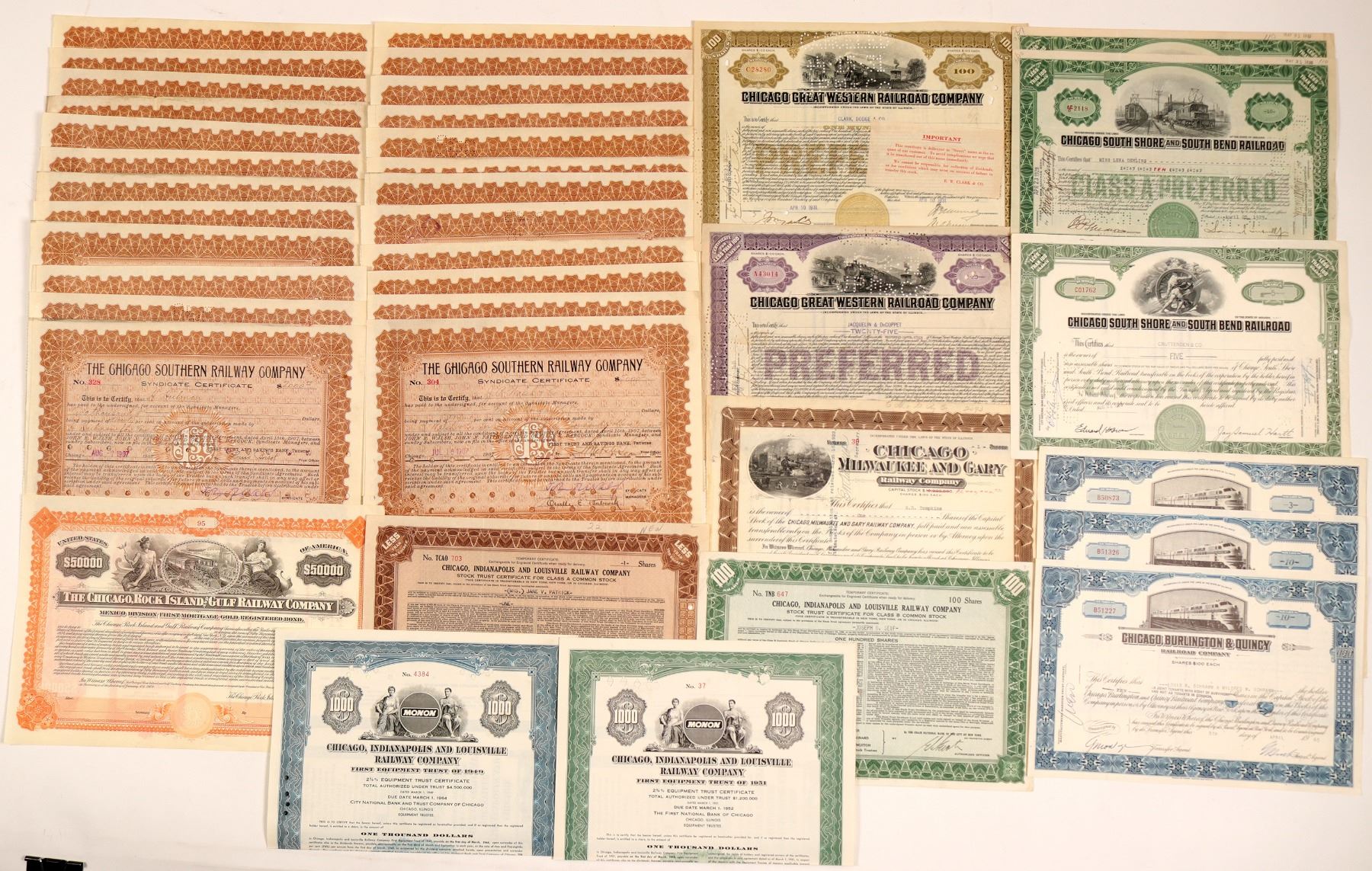36 certificates. 1. Three Chicago, Burlington & Quincy Railroad Co incorp 1855, I/U, common stock, Issued Apr 8, 1865, BLUE, vignette F7 #131 diesel, Franklin Bank Note Co. 2. Four Chicago, Indianapolis and Louisville Railway Co. incorp 1897 , I/U, $1000, Equipment Trust Cert., embossed seal, allegorical male/female vignette, Columbian Bank Note Co . #4384, BLUE, @ 5/8%, due 1964, issued March 1, 1964. #37, GREEN, 2 3/4% due 1952, issued March 1, 1951. #703, I/C, Trust certificate,BROWN, no vignette, issued July 29, 1946. #647, I/U, Trust Certificate, GREEN, no vignette, issued Feb 6, 1947. Security Bank Note Co. 3. Two Chicago Great Western Railroad Co incorp 1873 . I/C, preferred, printed seal, 4-6-4 w/cars @depot vignette, PREFERRED underprint, American Bank Note Co. #A43014, 25 shares, issued Feb 6, 1951, PURPLE and #C28280, 100 shares, issued April 10, 1931, OLIVE. 4. Chicago, Rock Island and Gulf Railway Co incorp 1902. #95, U/U, $50,000, 6%, First Mortgage Gold Bond, Mexico Division. Due 1934. Issue date Jan 1, 1904. Vignette 4-6-0 w/cars @depot, allegorical male/female on either side. Western Bank Note Co. 5. Three Chicago South Shore and South Bend Railroad incorp 1925. I/C, GREEN, printed seal, American Bank Note Co. Two preferred 6 1/2% , vignette two electric loco @ depot, CLASS A PREFERRED green underprint, #2024 issued April 10, 1929 and #2118 issued April 10, 1929. One, I/U, common stock, vignette allegorical male turns wheel, COMMON green underprint, issued Aug 24, 1956. 6. Chicago, Milwaukee and Gary Railway Co. #39, I/U, 1 share common stock, issued June 18, 1921. BROWN, embossed seal, vignette upper left 4-6-0 w. cars @ rail yard. Western Bank Note Co. 7. Twenty-three The Chicago Southern Railway Co, incorp 1904. All I/C, BROWN, various 300 and 400 series numbers, no vignette, no seal, "1st " brown underprint, issue date from July-Sept, 1907. Western Bank Note Co. Ken Prag Collection