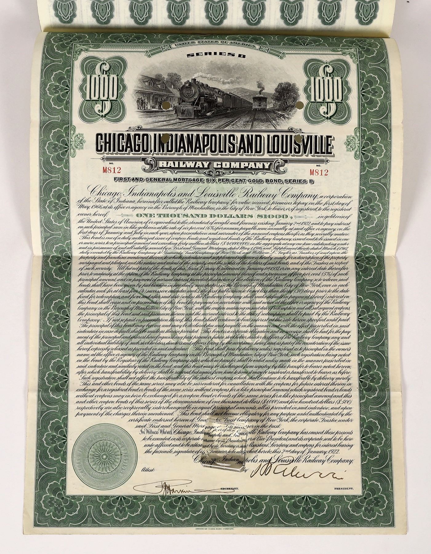 Chicago Indianapolis and Louisville Railway Co, First and General Mortgage Bond, 1922, No. M812, $1000, signed by president and secretary (illegible), 14x10", with 1.5 sheets coupons attached, i/c, 1 cert