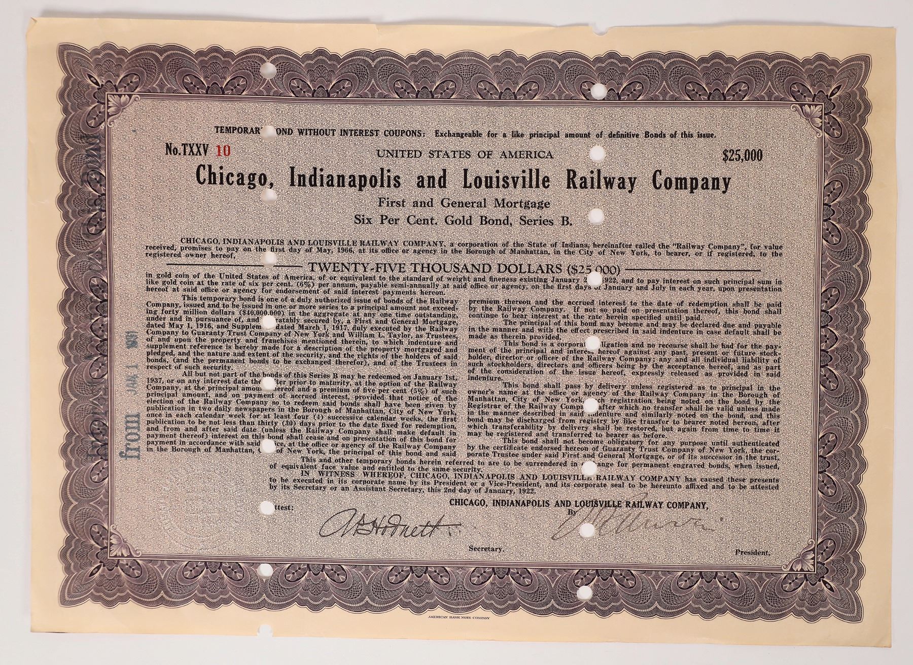 Chicago Indianapolis and Louisville Railway Co, First and General Mortgage Bond, No. TXXV10, $25,000, 1922, signed by president and secretary (illegible), 13.5x10", i/c, 1 cert