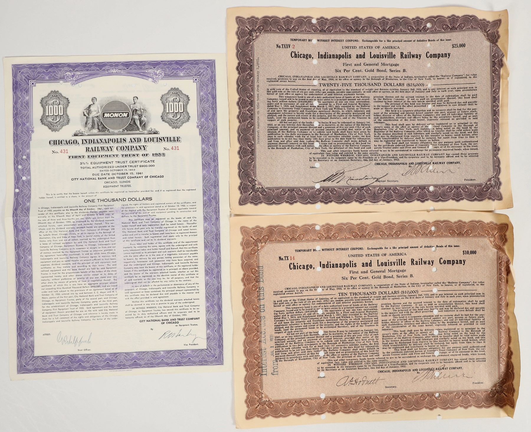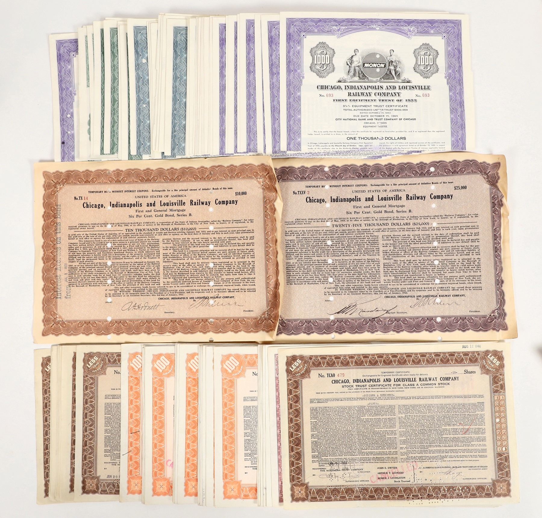 About 150 stocks and equipment trust certificates from the Chicago, Indianapolis and Louisville Railway. Purple, green, orange, blue, brown ink.