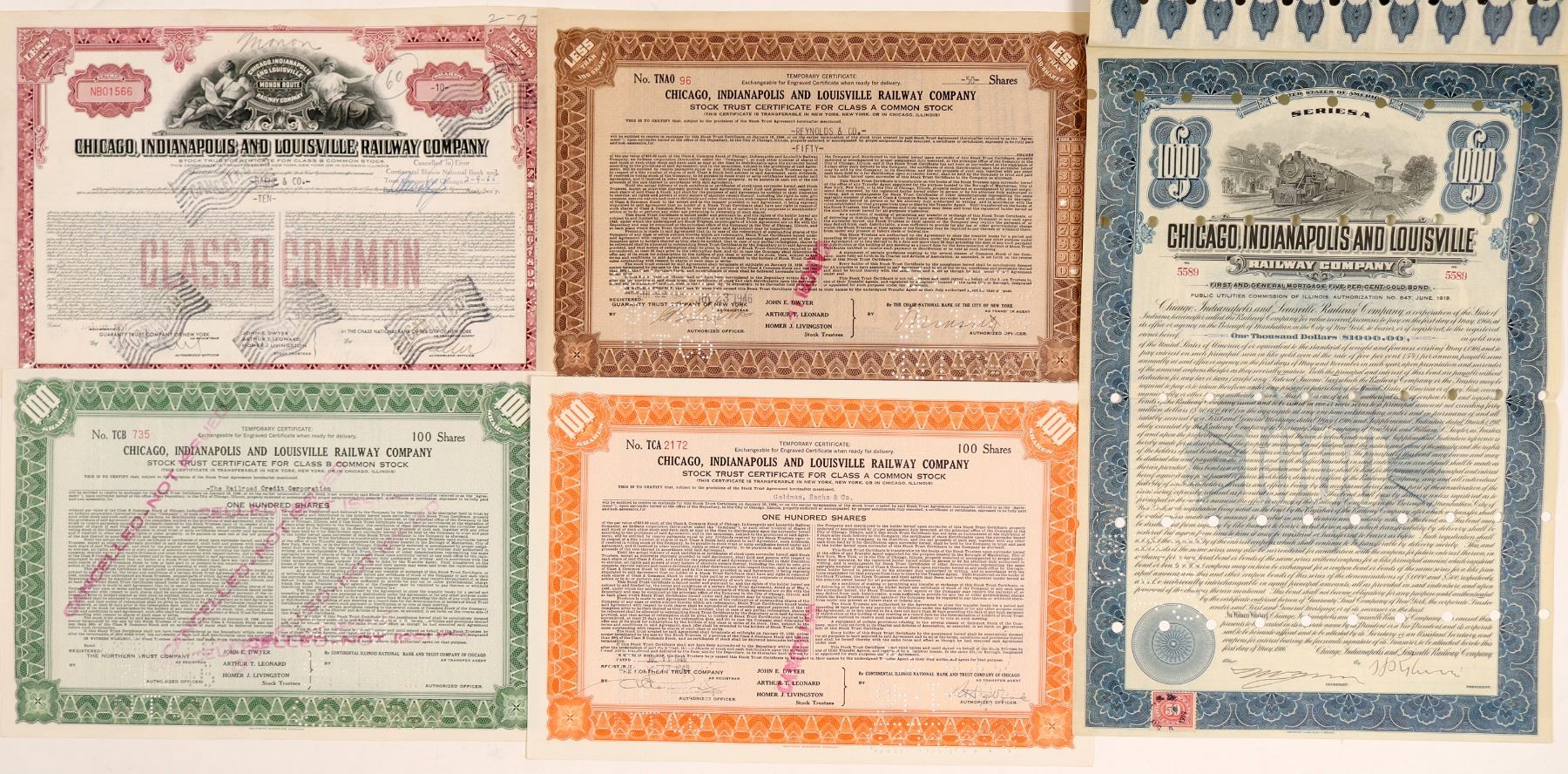 5 certificates. Incorp 1897, operated until 1956. One, I/C, BLUE ,$1000 First General Mortgage , 5 %, gold bearer bond due 1919. Issued May 1, 1916, vignette 4-6-4 @ depot, revenue stamp, #34-100 coupons attached w/ allegorical male vignette, American Bank Note Co. Three , I/C, 100 shares Stock Trust Certificate, issued 1946, no vignette: one ORANGE class A, one GREEN class B. One BROWN, class A 50 shares and one RED, class B 10 shares, Security Bank Note Co. Ken Prag Collection