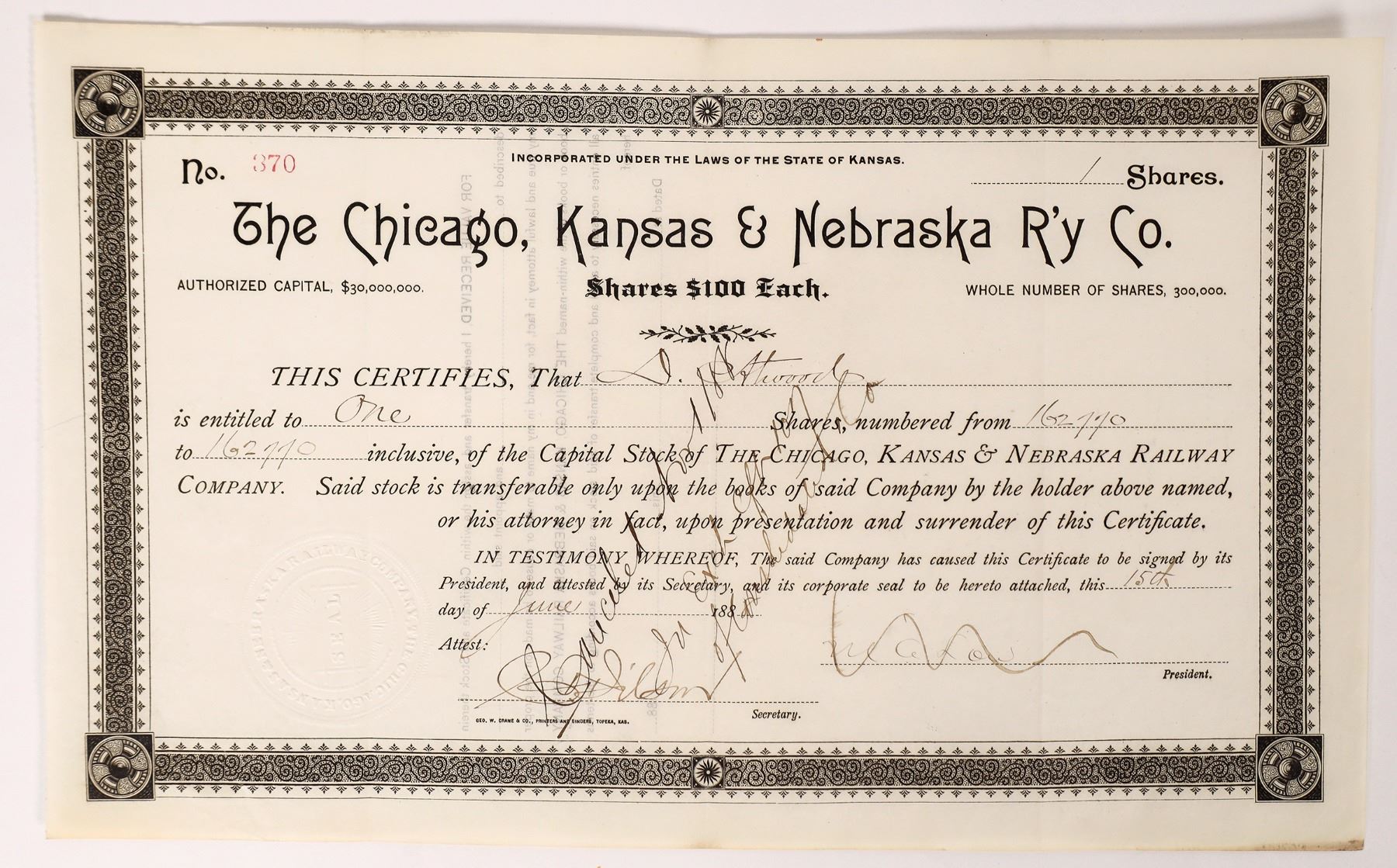 Chicago Kansas & Nebraska R'y Co, Stock, Incorp Kansas, No. 370, one share, issued to D. Atwood, signed by MC Low as president, secretary (illegible), 1888, 12.5x8", i/c, 1 cert
