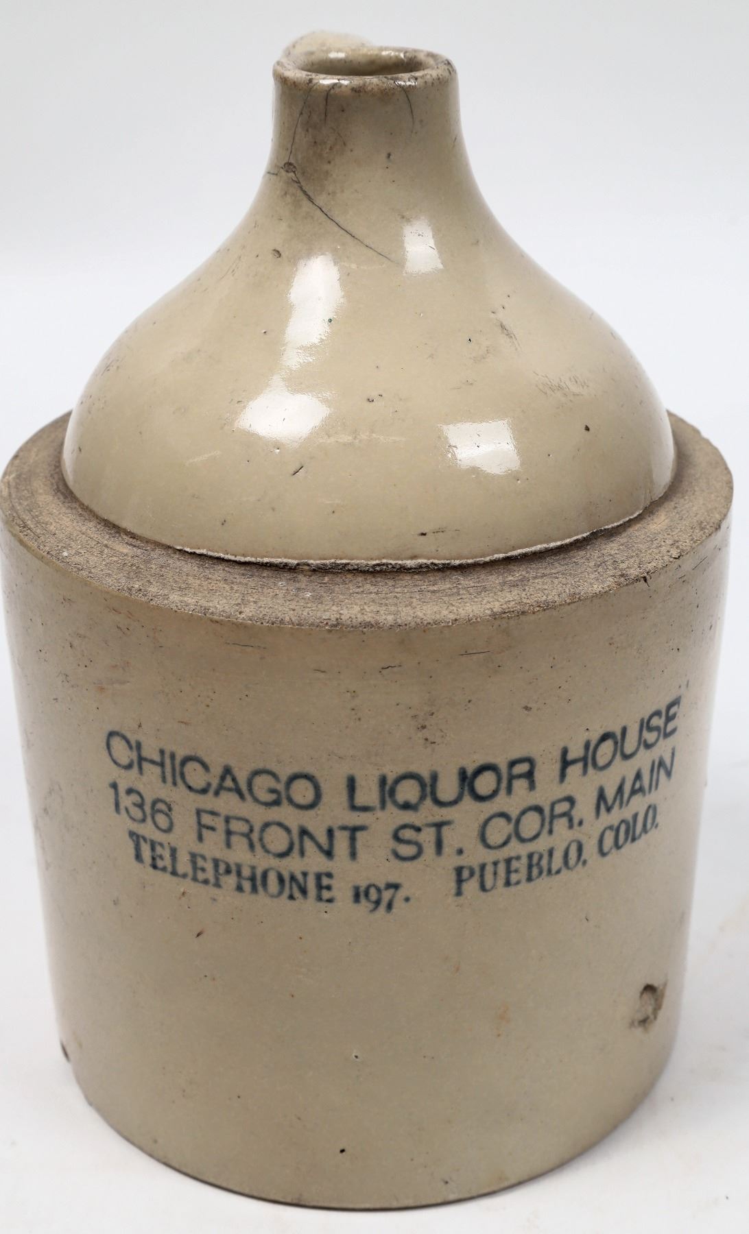 CHICAGO LIQUOR HOUSE/136 FRONT ST. COR.MAIN/TELEPHONE 197. PUEBLO, COLO. 1/2 gallon jug. Another unlisted variant. Notice the difference in address and font in the stenciling from the previous lot. White glaze, 9' tall. As made ( glaze shows over the surface of the removed piece ), 1/2" piece missing on lower right side of jug. Three, 1 1/2" hairline cracks radiating from what looks like an ice pick size strike on the neck. No other damage visible.