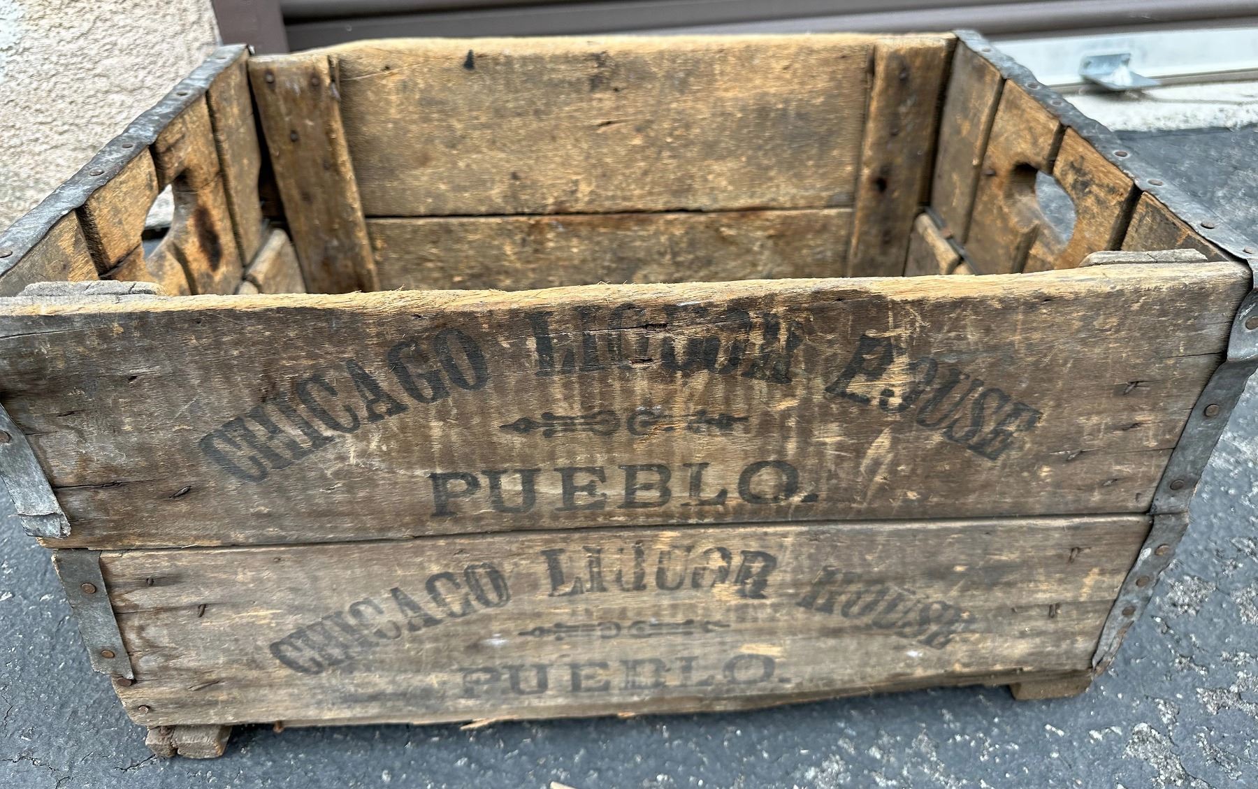 Original vintage wood box, c 1890-1915. 14 x 21.5 x 12" high. Possibly held quart whiskies? This merchant also had ceramic jugs. Bracken Collection. Colorado Pueblo