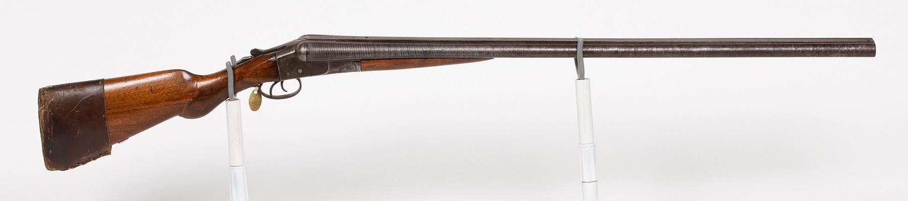 Chicago Long Range Wonder (Trade Name), Black Powder, SxS Damascus Barrel, front sight bead missing, leather butt stock cover. Manufactured by Andrew Fyrberg & Sons Mfg Company 1903 to 1905. It was manufactured by the Meriden Fire Arms Co. from 1905 to 1908 and by the Crescent Fire Arms Company from 1908 to 1918. The name was used by the J. Stevens Arms company from 1918 to 1925. All the guns by this name were made to be sold by Sears, Roebuck & Company. SN: 21750, JMD Oval Tag: 8061, Condition: Good, >