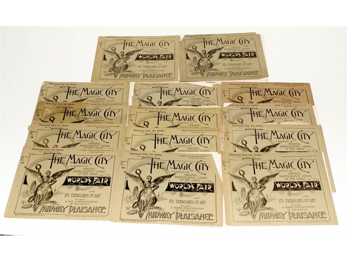 The Magic City: A Portfolio of Original Photographic Views of the Great Worlds Fair and its Treasures of Art including a Graphic Representation of the Famous Midway Plaisance. Part of the “Historical Fine Art Series.” In 17 volumes! A great set as all 17 volumes are include. In various conditions. Some booklets have the front and back cover separated. Dog ears, rips, tears, and stains on some pages, but the actual art seems to be in very god shape!