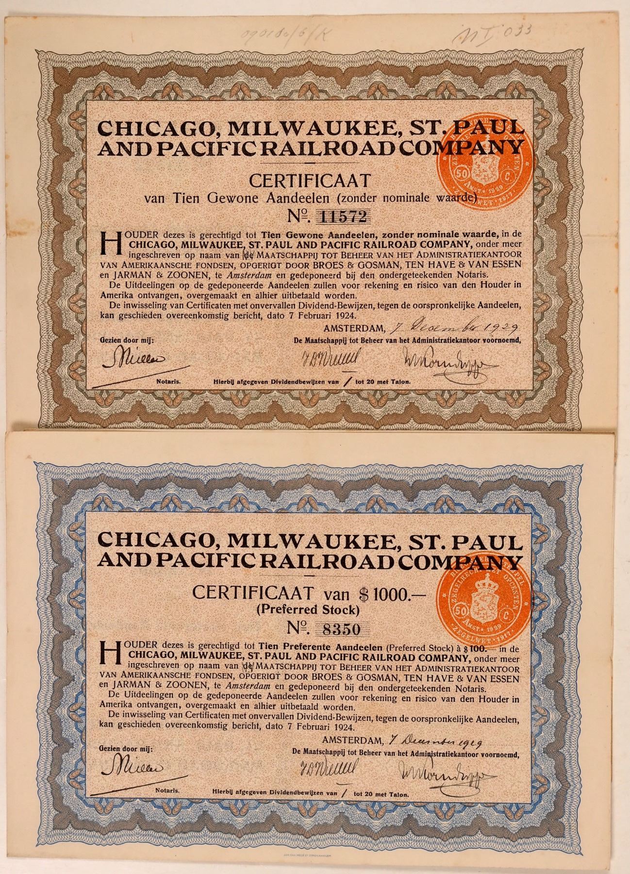 One common and one preferred stock, both issued at Amsterdam in 1929. Both are uncancelled.