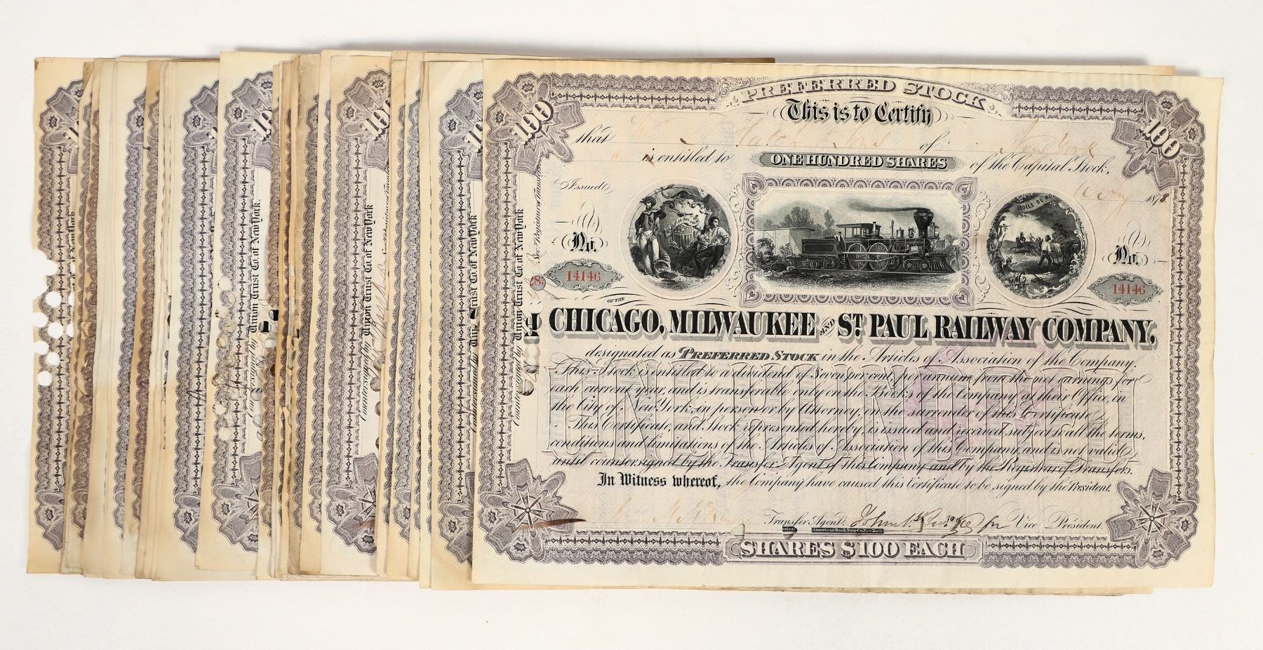 About 25 issued preferred stock certificates mostly dated 1878 in the Chicago, Milwaukee & St. Paul Railway Company. Three nice vignettes. Attractive purple ink.