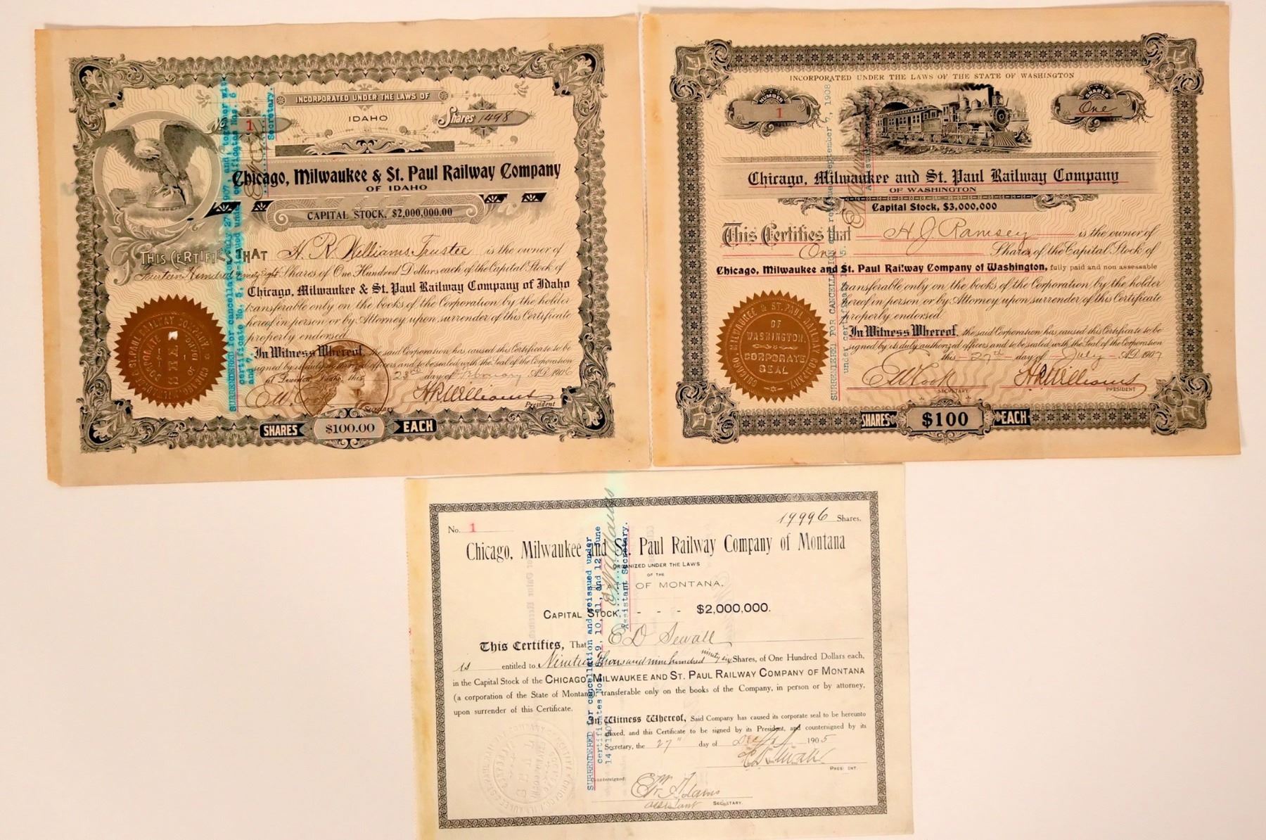 Lot of three different number 1 issued. 1) Chicago, Milwaukee & St. Paul Railway Company of Montana. Issued in 1905, stamp and punch cancelled. 2) Chicago, Milwaukee & St. Paul Railway Company of Idaho. Issued in 1906, stamp cancelled. Eagle vignette. 3) Chicago, Milwaukee & St. Paul Railway Company of Washington. Issued in 1907, stamp cancelled. Locomotive vignette. Interesting trio. These three states made up the "Pacific Extension" of this Mid-West railroad. This extension was approved in 1905.