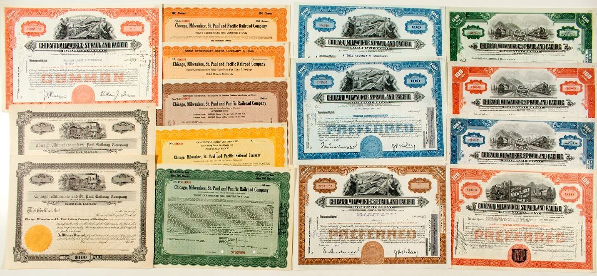 Lot of 14 of many different types. Earliest two are unissued (190-), followed by four larger issued certificates, all different, issued 1930-1944, all not cancelled with vignettes. Also: four unused scrip certificates. Last, three later certificates (two different) issued 1970 with different vignette than before. Punch cancelled. (Prag Collection) City: State: Washington Date: 1900s-1970 hwac# 34102