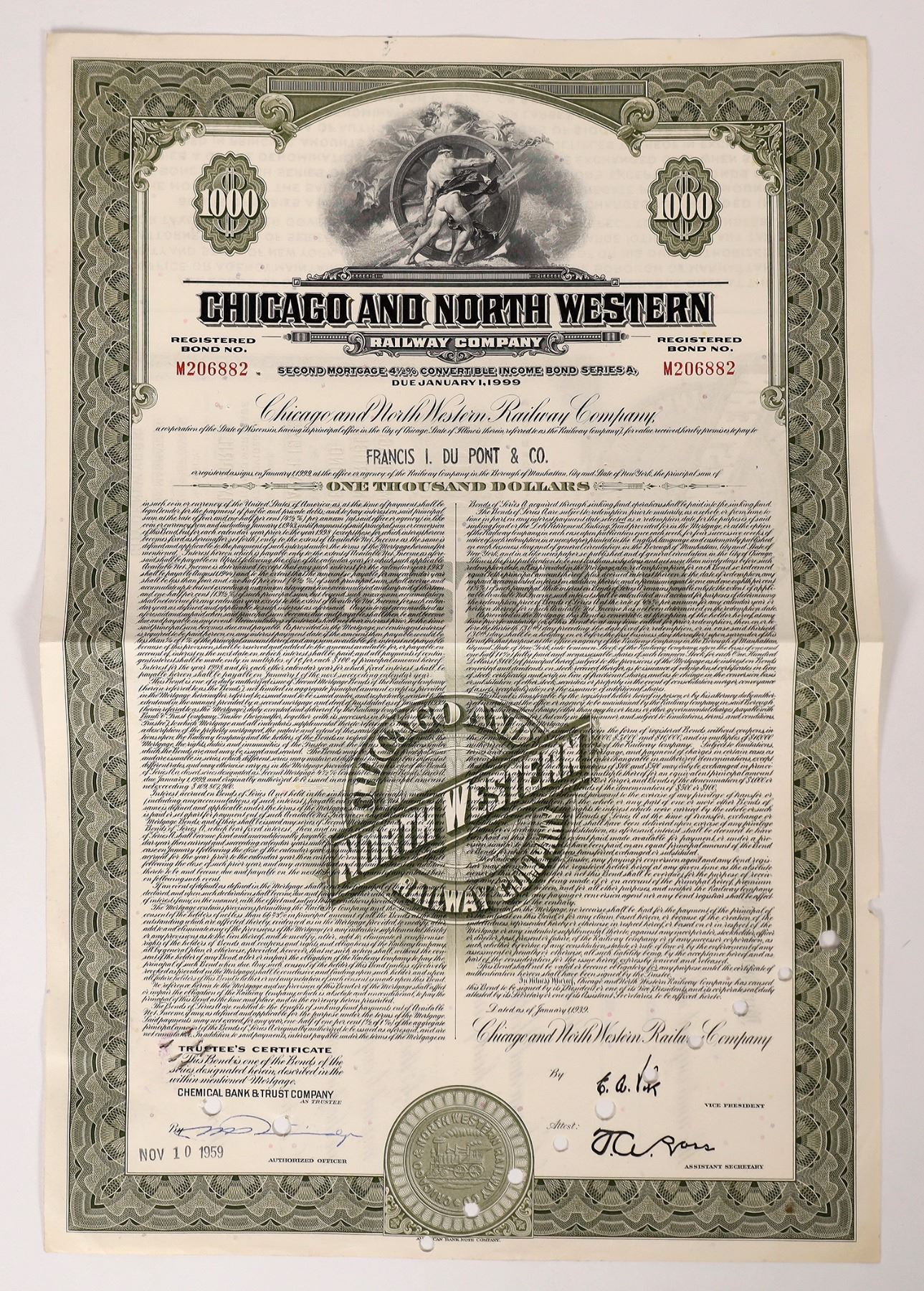 Chicago and North Western Railway Co, Second Mortgage Bond, No. M206882, $1000, signed by vice president and assistant secretary, 1939, 10x15", i/c, one revenue stamp, 1 cert