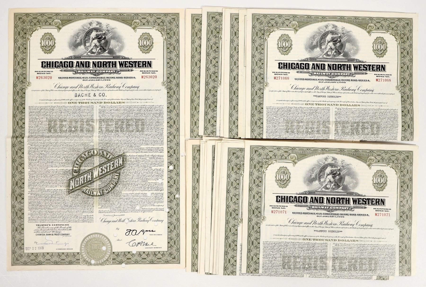 About 20+ Chicago and North Western Railway Company Bonds. Green ink, He-man vignette.