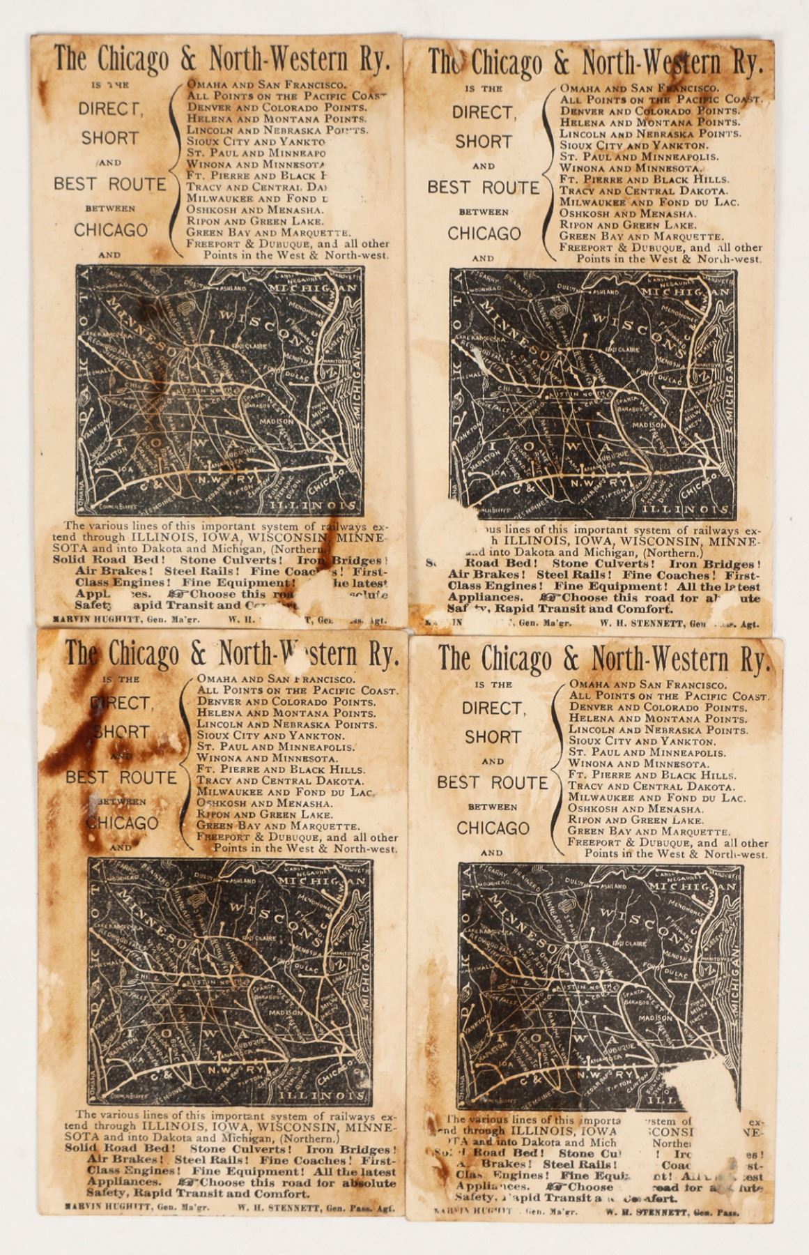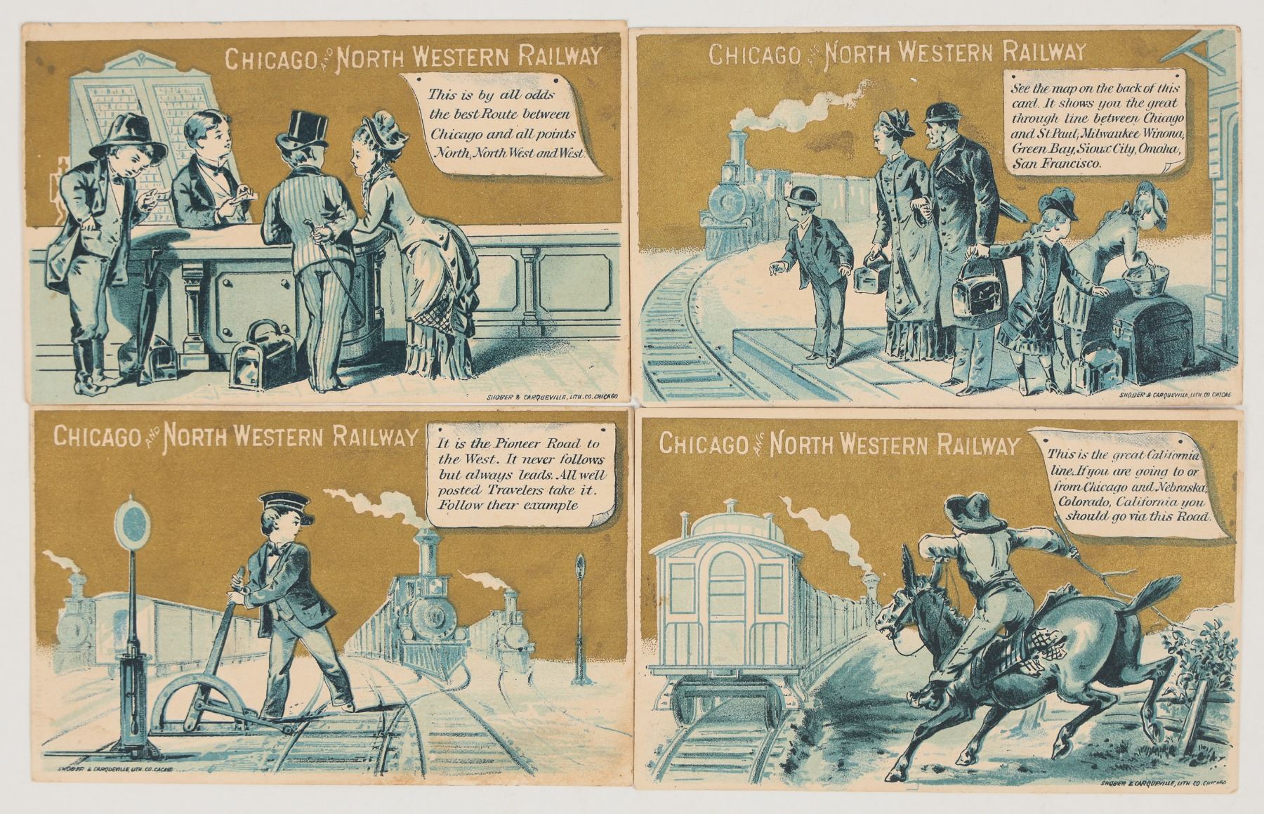 Lot of 4. Chicago & North Western Railway Trade Cards. Suite of trade cards, picture on front of each : Brakeman switching track, Family waiting at depot, Miner on mule chasing train and At counter booking ticket. The back has map of the train routs and it's stops listed. Some age discoloration , otherwise in very good condition.