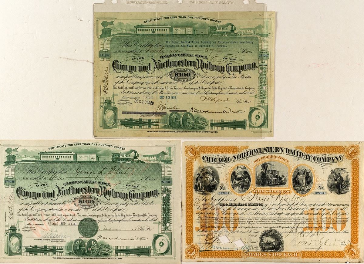 Lot of three, two different types. First, an 1887 issued certificate, punch cancelled, orange border with six vignettes (patriotic and train related). Second, two gorgeous later certificates that are very illustrated. Issued 1929 (not cancelled) & 1936 (punch and pen cancelled). Both are green and feature an elaborate locomotive vignette: train on the top with tracks that wrap around the border and additional vignettes of train parts. (Prag Collection) City: Chicago State: Illinois Date: 1887-1936 hwac# 34655